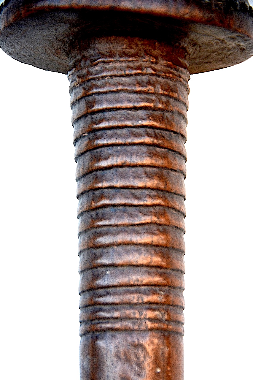 La tête est ornée de clous en zinc, une rangée circulaire en haut et en bas, rejointe par six rangées verticales raccordantes.
