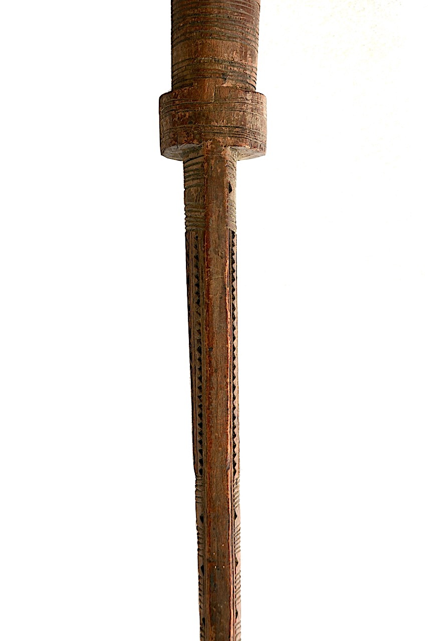 Le bois est léger, monobloc de section ovoïde en diminution pour la représentation de la lame.