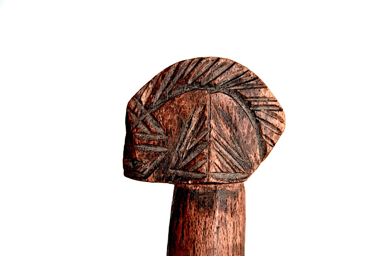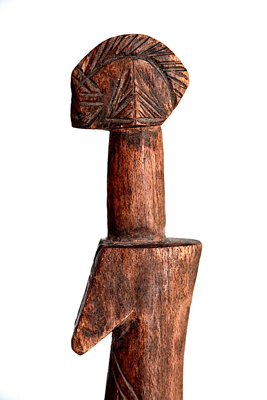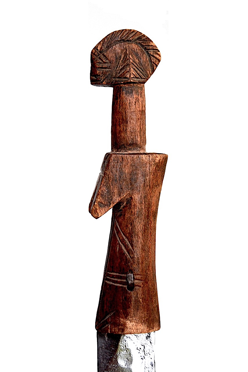 Le haut du manche sculpté de ce petit couteau rappelle nettement les têtes des célèbres poupées, l’une des principales productions des sculpteurs Mossi.