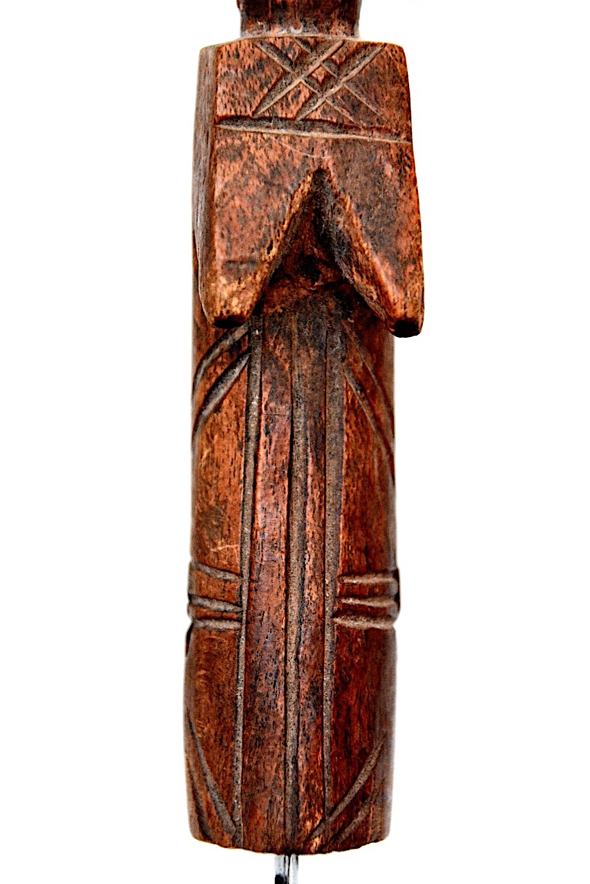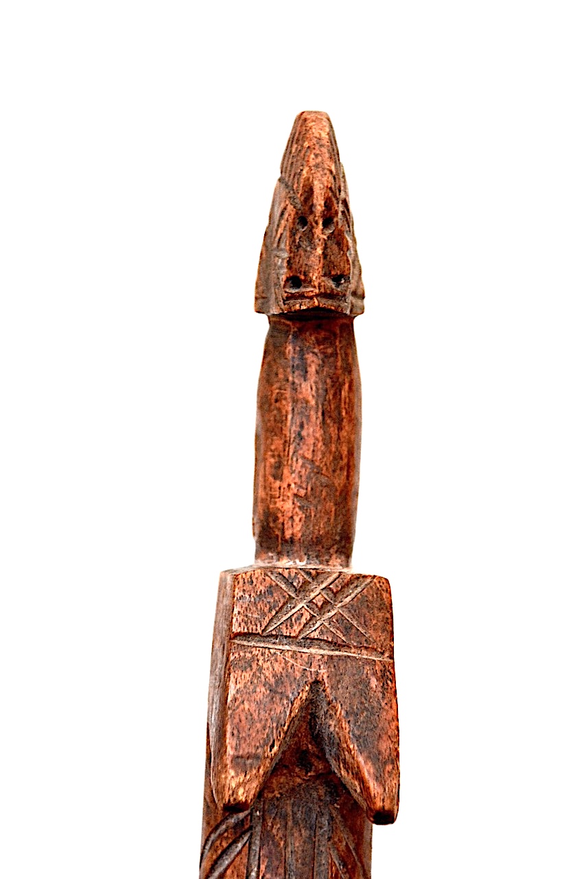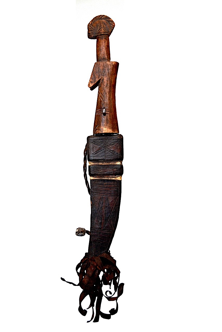 Le haut du manche sculpté de ce petit couteau rappelle nettement les têtes des célèbres poupées, l’une des principales productions des sculpteurs Mossi.