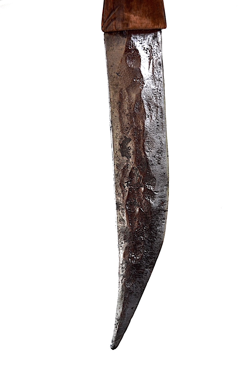 La lame est en fer, courbée en bout à peine bombé, possède de nombreuses marques de martelage.