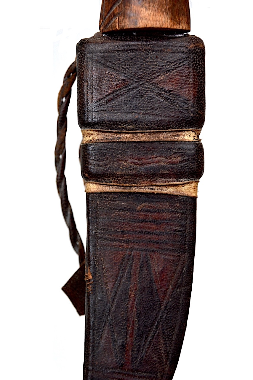 L’étui est gravé de motifs cosmogoniques linaires et d’un bouquet de petites lanières de cuir en terminal.