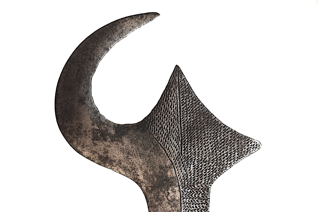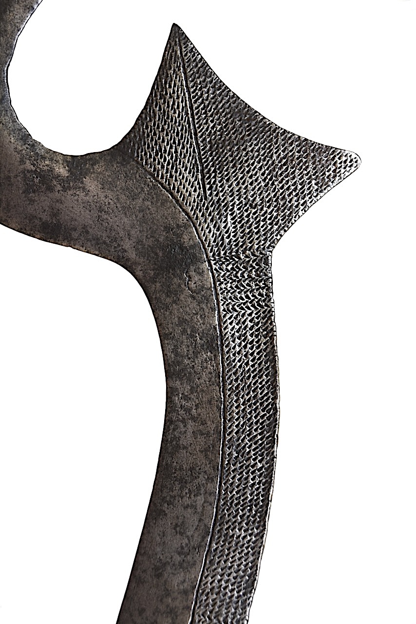 Une des parties triangulaire ou excroissances naît à la base de la poignée, une autre légèrement plus courte à environ un tiers de la hauteur et la dernière, plus importante, se marie avec la pointe centrale se trouvant presque dans l’axe de la pointe plus haute et courbe de la partie droite et non ciselée.