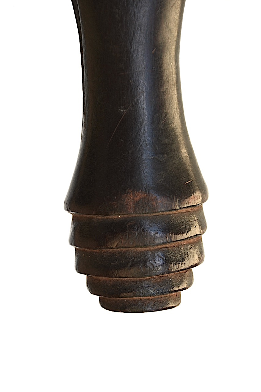 La poignée en bois et sombre est de base elliptique au départ, cylindrique à cônes superposés et à étranglement central.