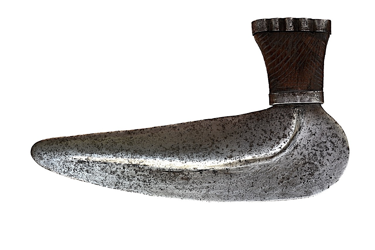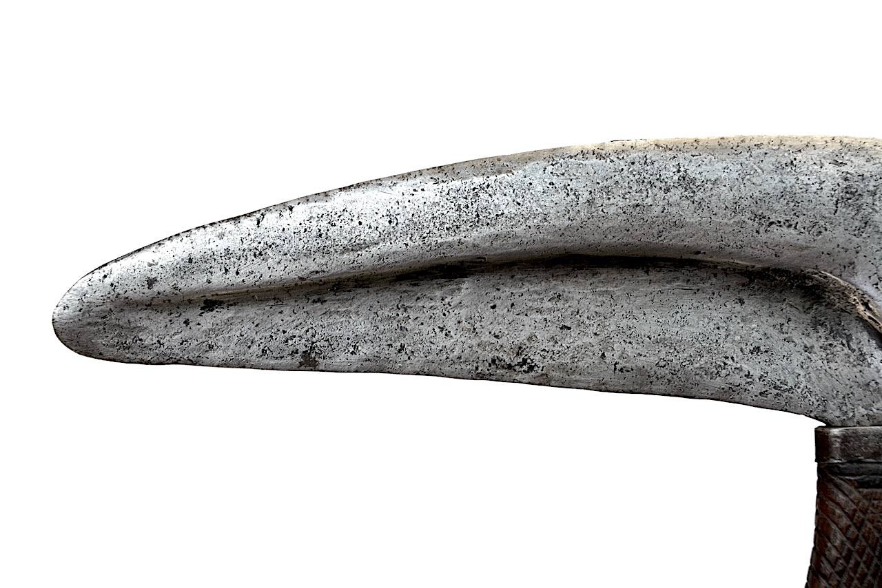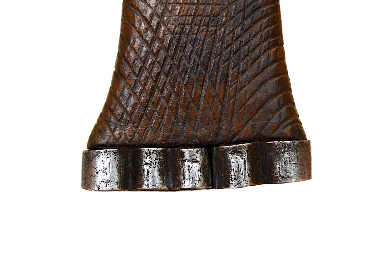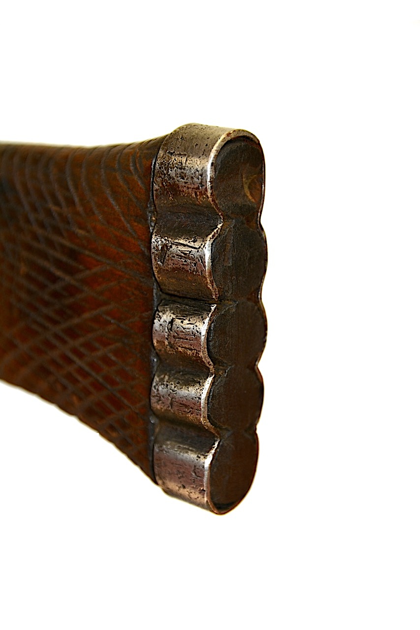 La poignée en bois est marquée de lignes verticales croisées avec des lignes en courbes suivant son évasement extérieur.