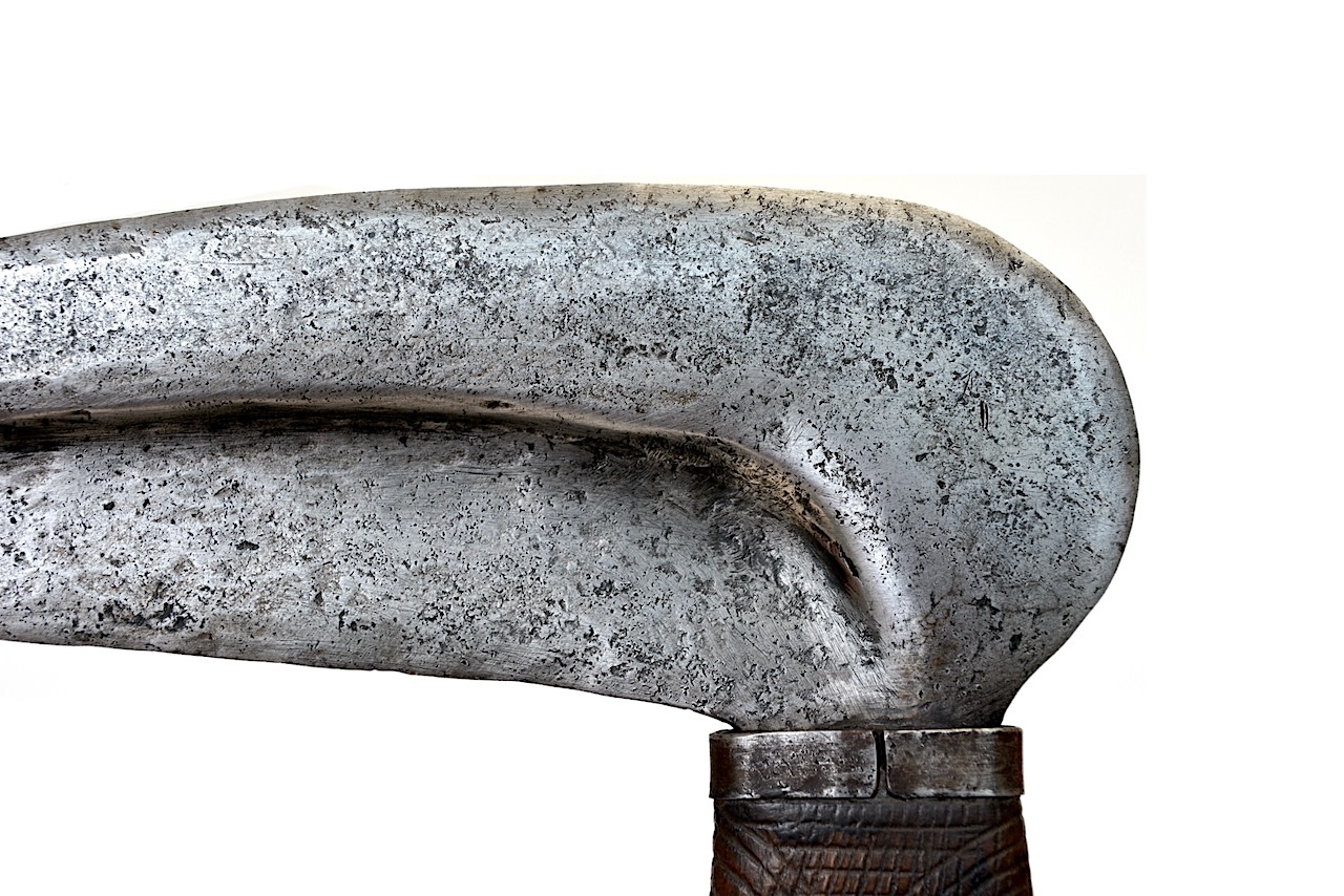 La lame est épaisse avec un repoussé central formant quasiment un épaulement mettant la lame sur deux plans et formant une arête très en relief, ce qui la renforce encore plus.