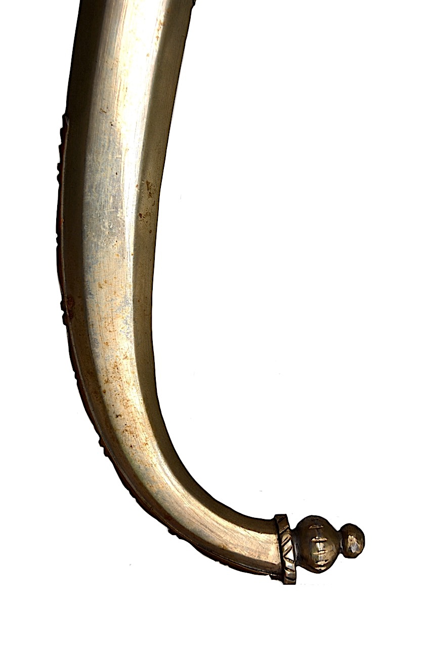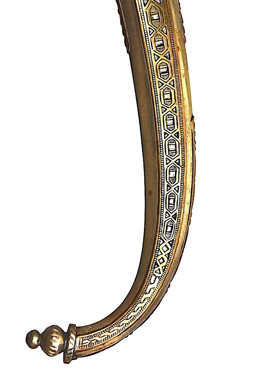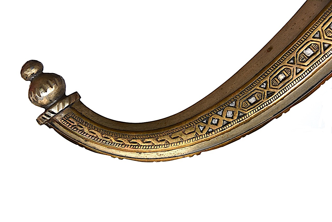 Le côté chape présente une couronne en habillage, au dessus d’une section plus petite en forme de losange ornée d’une plaque en laiton faisant le tour et ciselée de jolies arabesques, ceinturée par une bordure en argent.