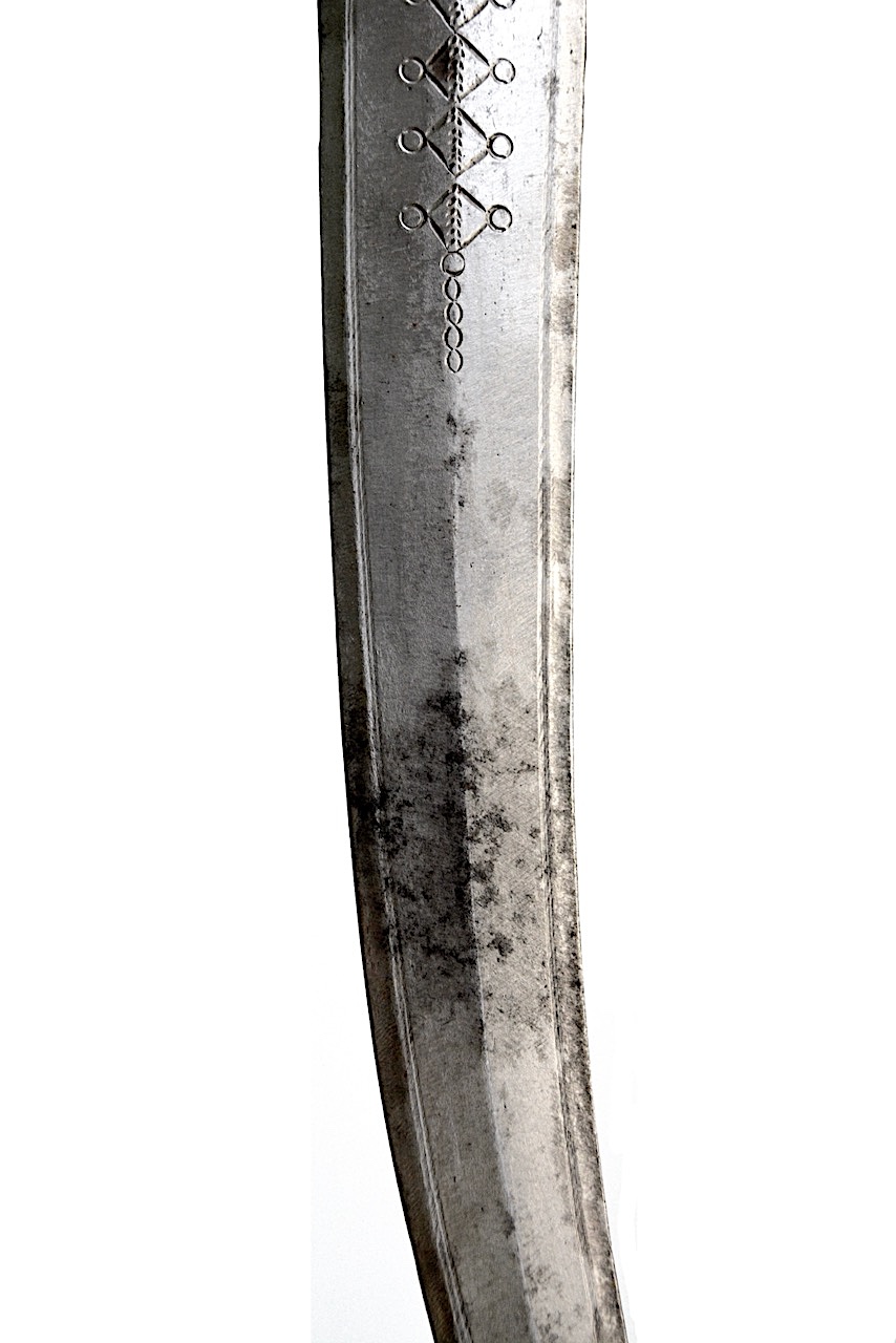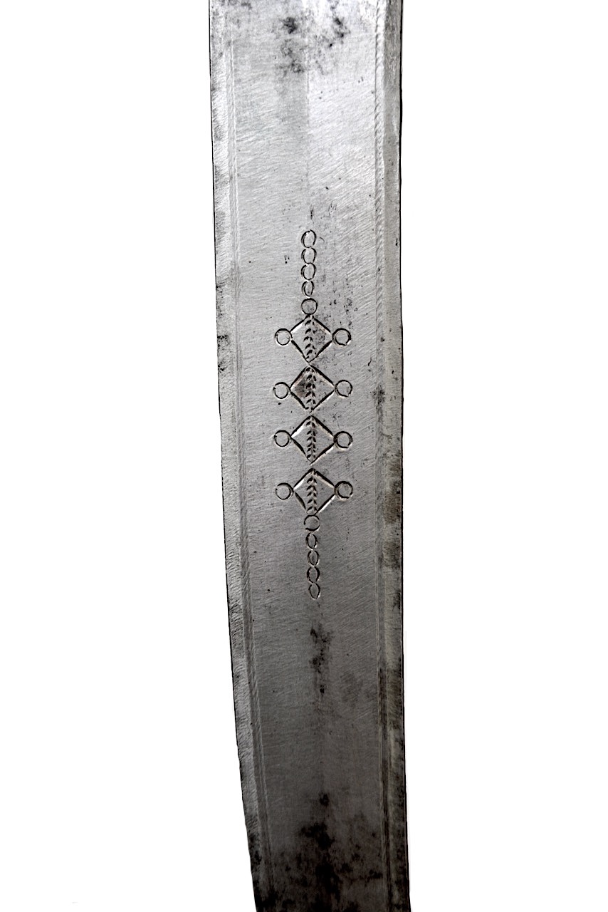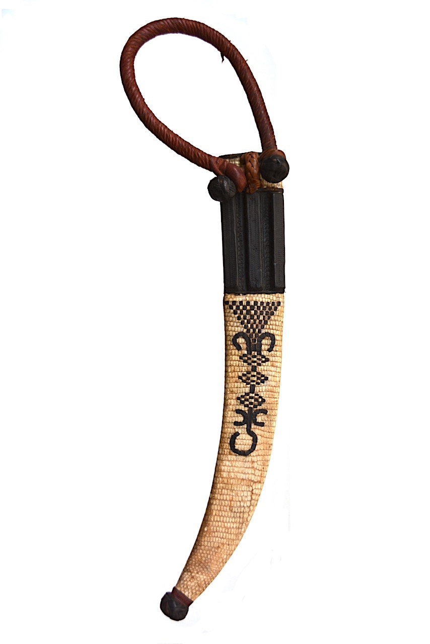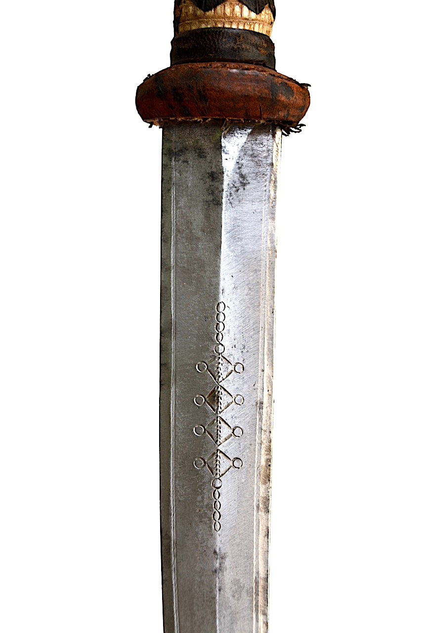 Beau couteau avec une lame forgée en en un seul morceau y compris le bout de forme ogival à nervure centrale et bord relevé typique de l’ethnie Tedda.