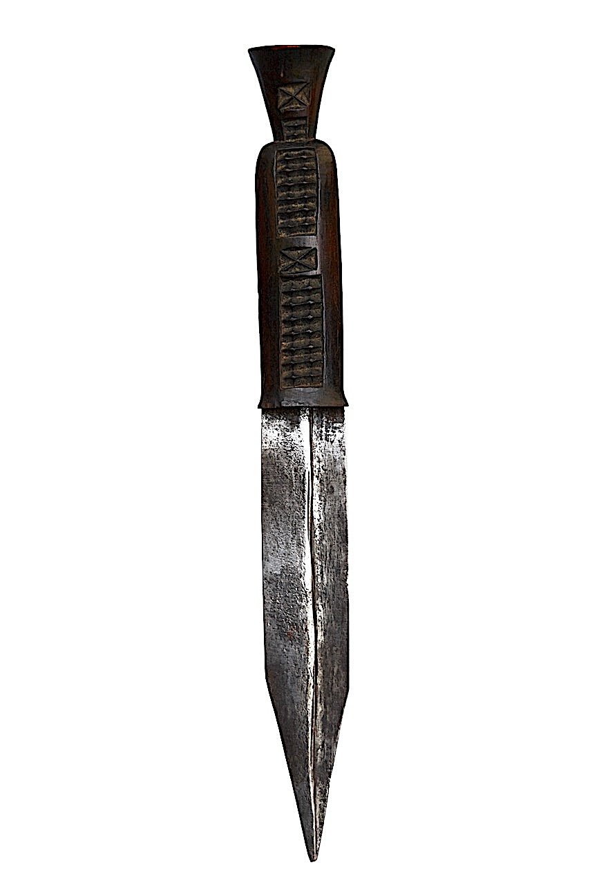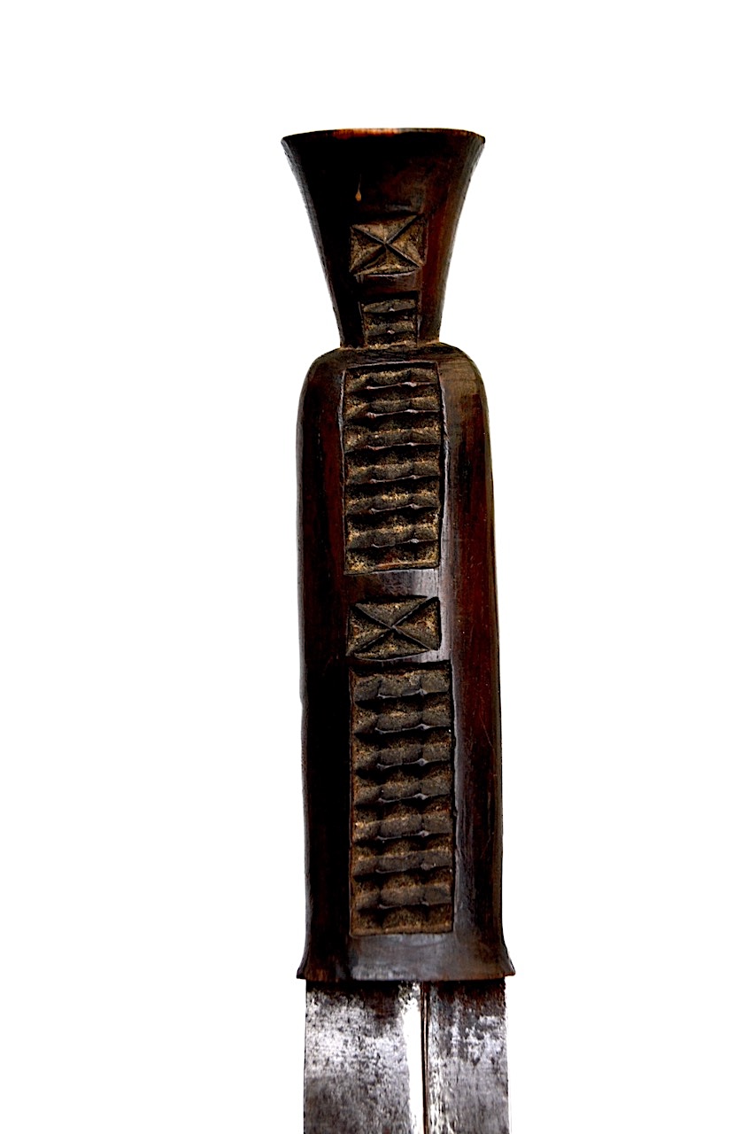 Couteau à double tranchant utilisé dans les cérémonies religieuses, distingué par sa lame – à double plans en épaulement – ce qui renforce la rigidité de la lame.