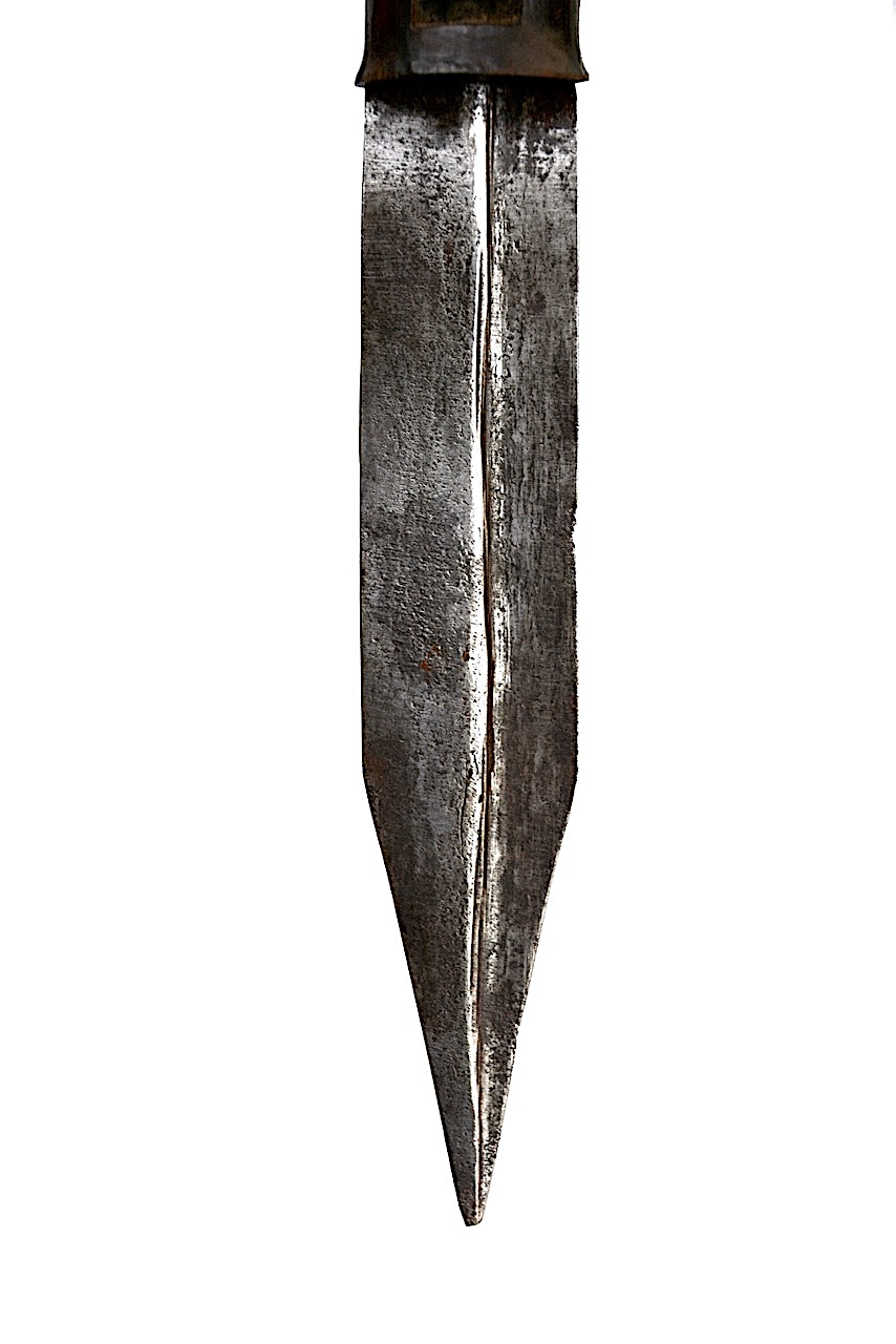 La lame est bien ancrée dans une poignée en bois d’ébène de section ovale avec en haut une partie conique montant en évasement.