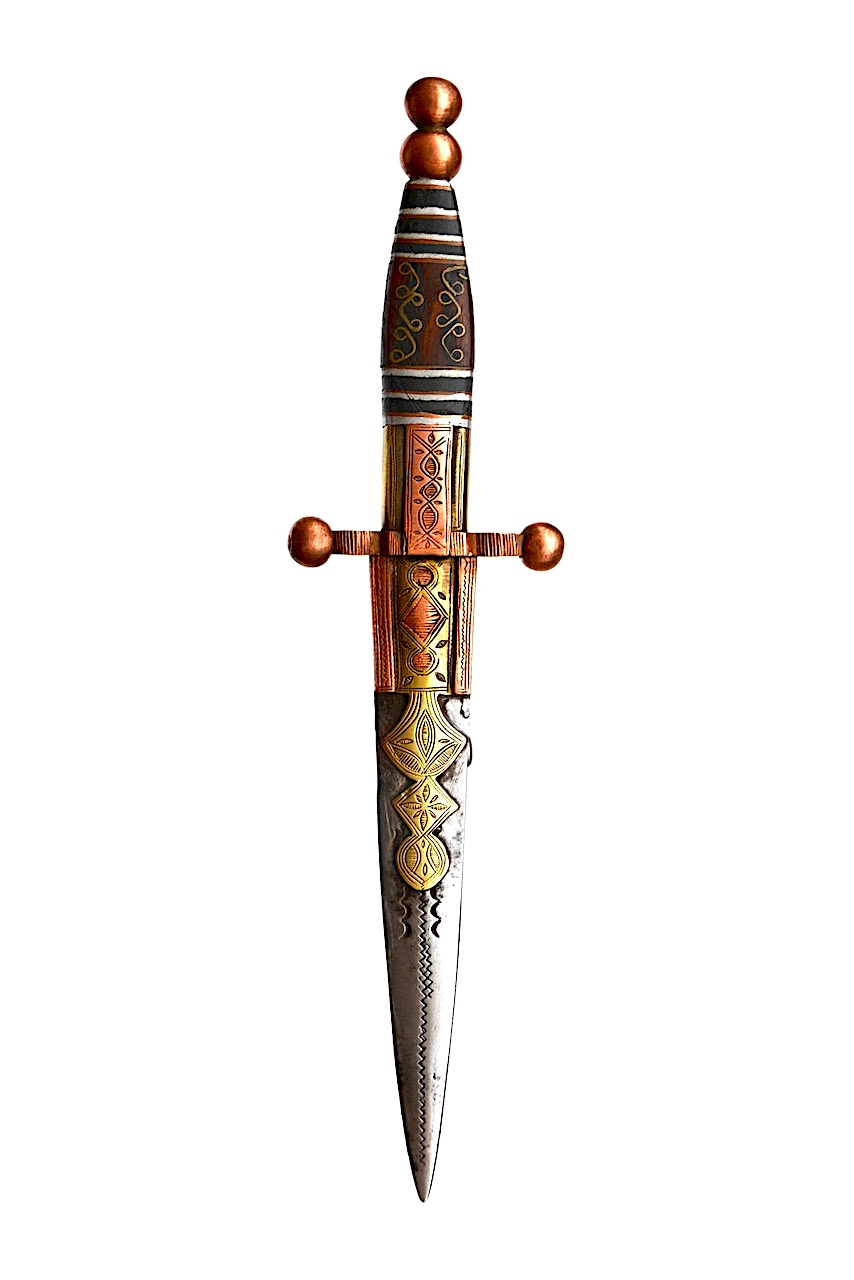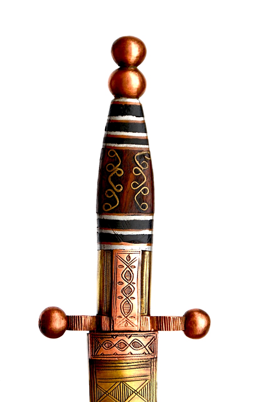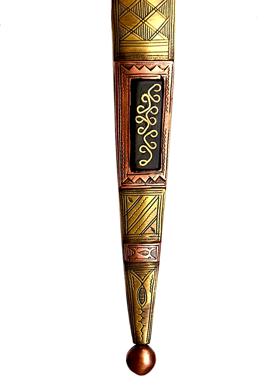 Le bout de la poignée est couronnée de deux boules de cuivre superposées