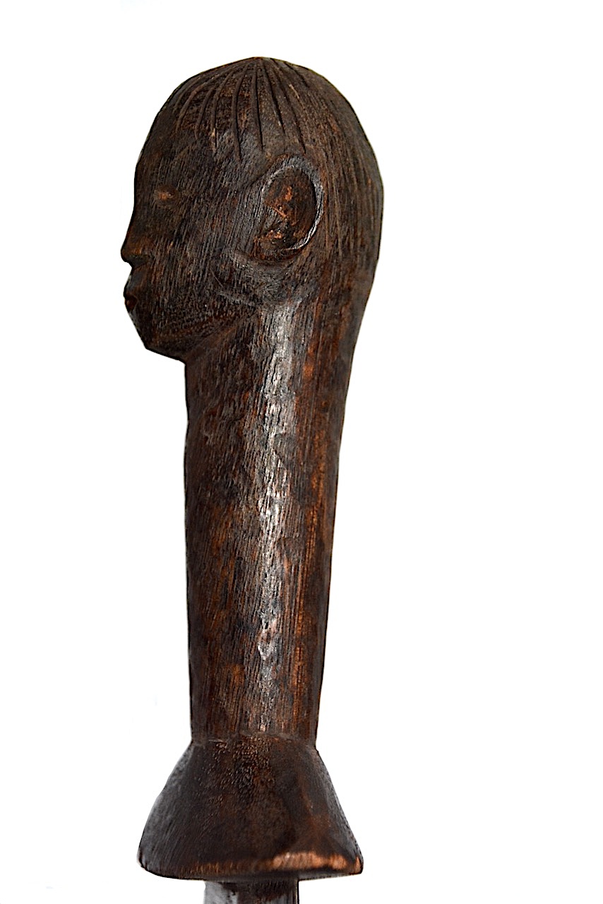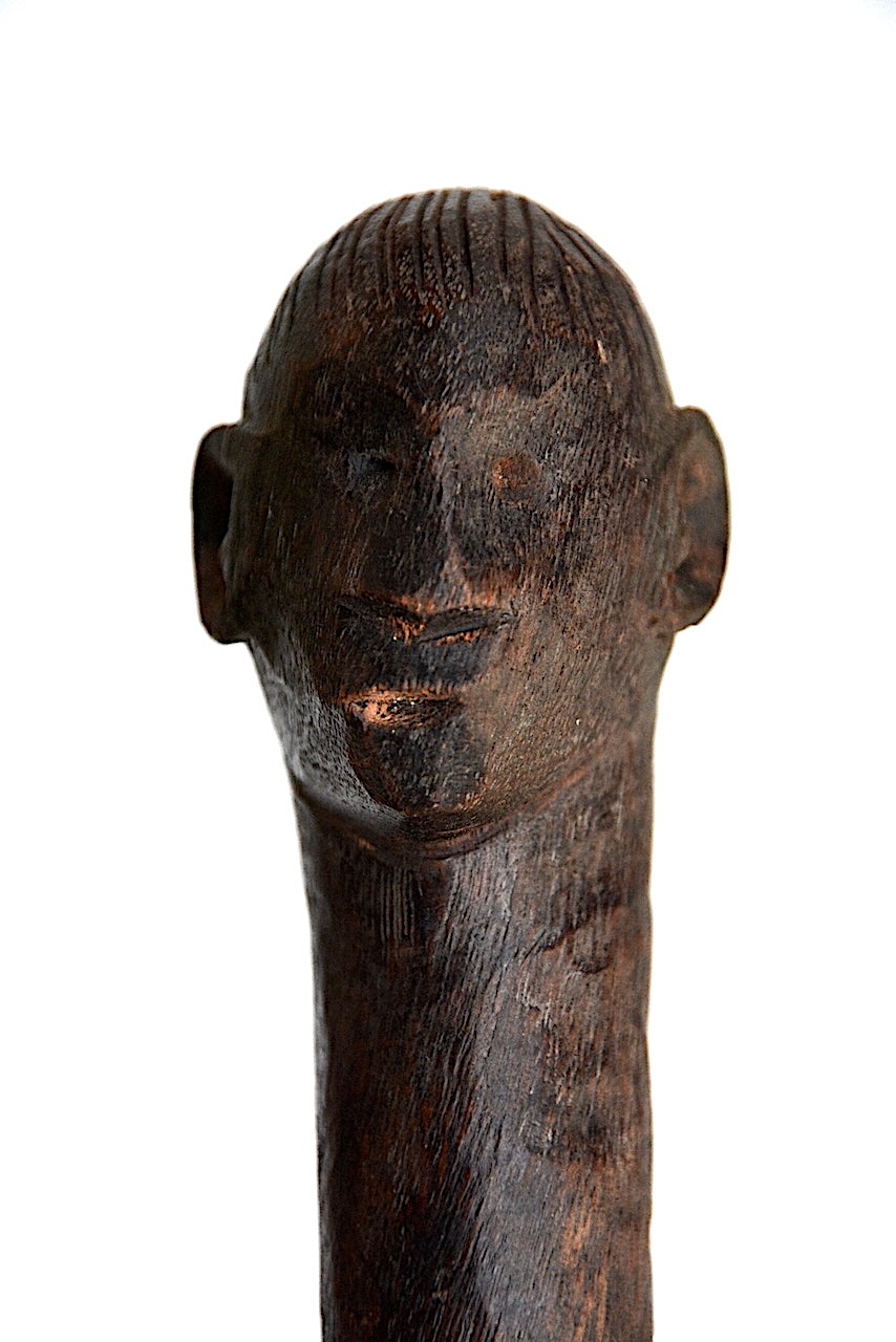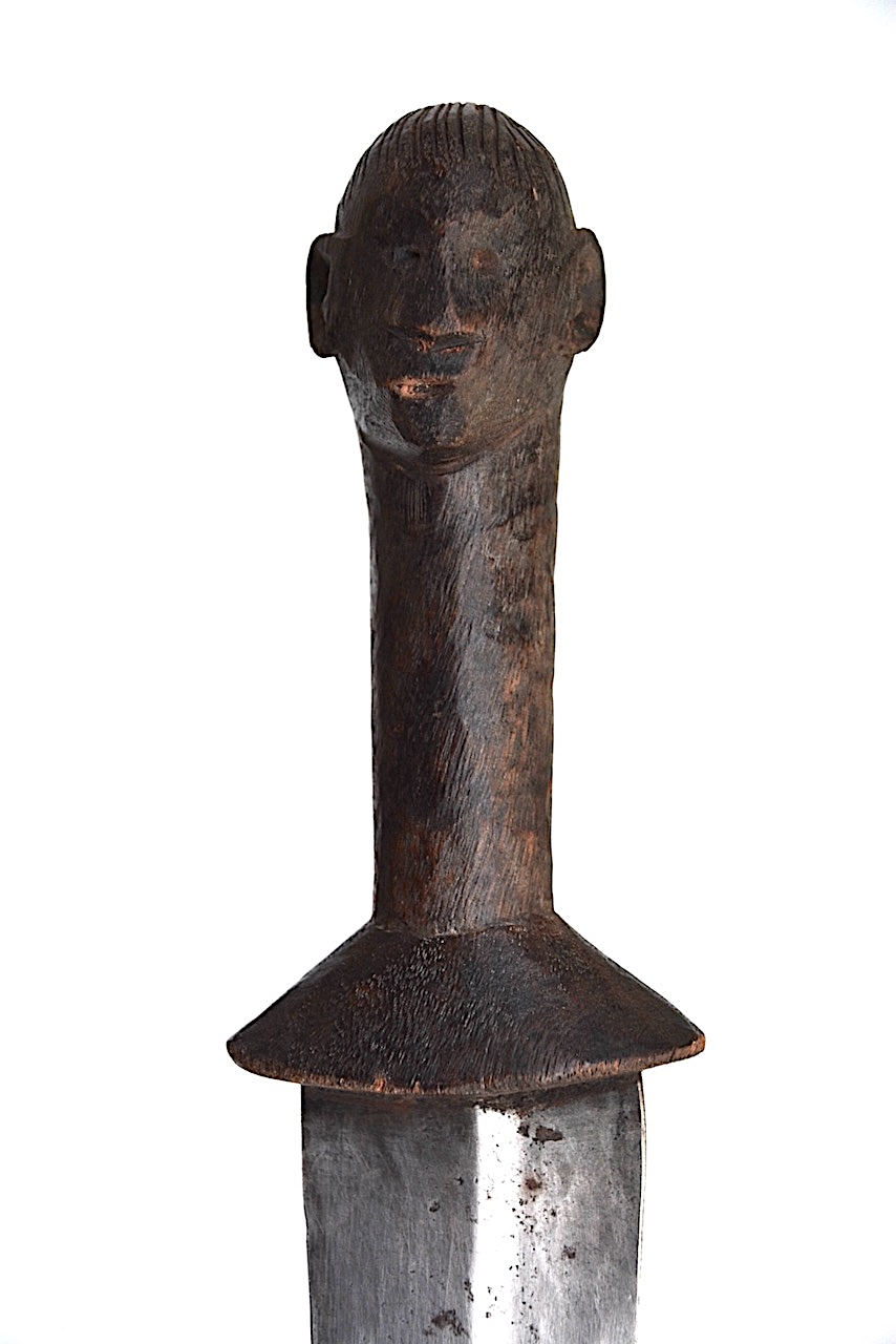 La poignée en bois présente une chape évasée plus large que la lame, un corps cylindrique avec une tête anthropomorphe sculptée en terminal.