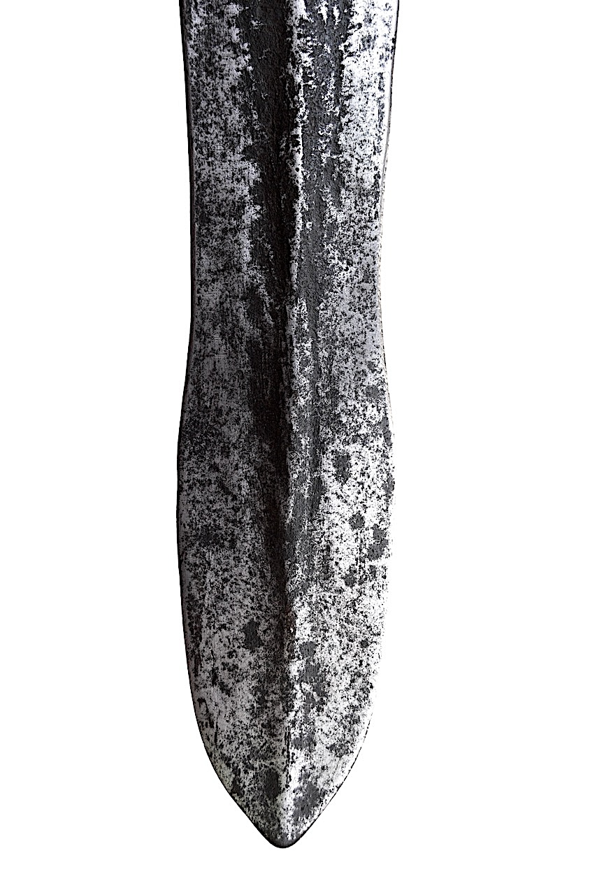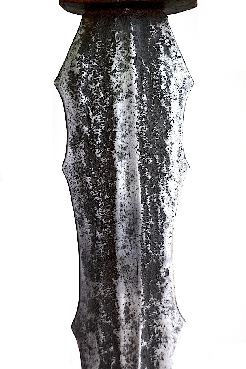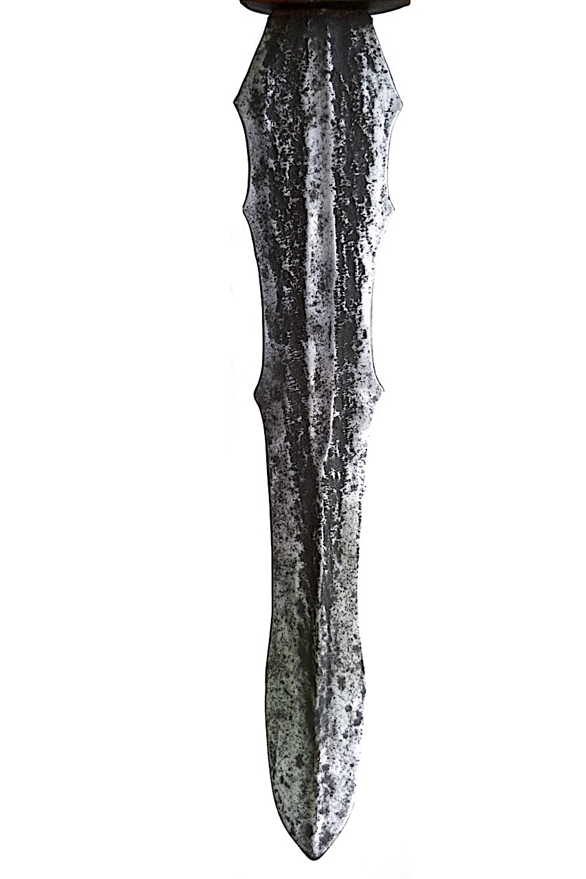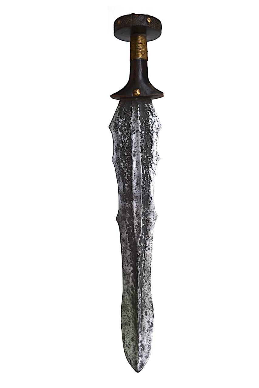 Épée courte à grande lame symétrique lancéolée en vagues, formant trois ergots et trois étranglements sur la longueur.