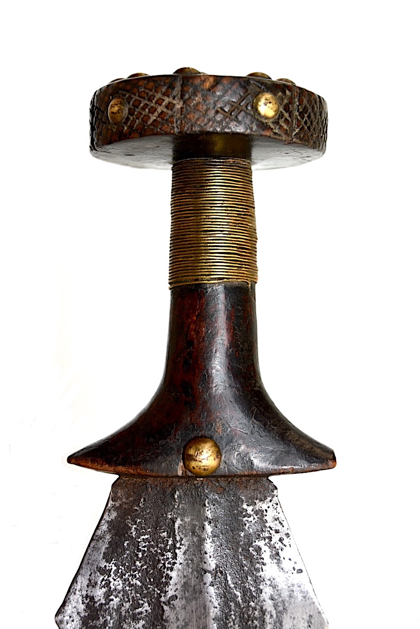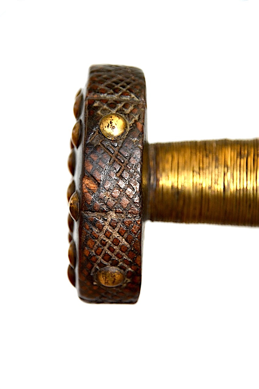 La poignée est en bois avec chape évasée vers l’extérieur et un clou de laiton centré de chaque côté.