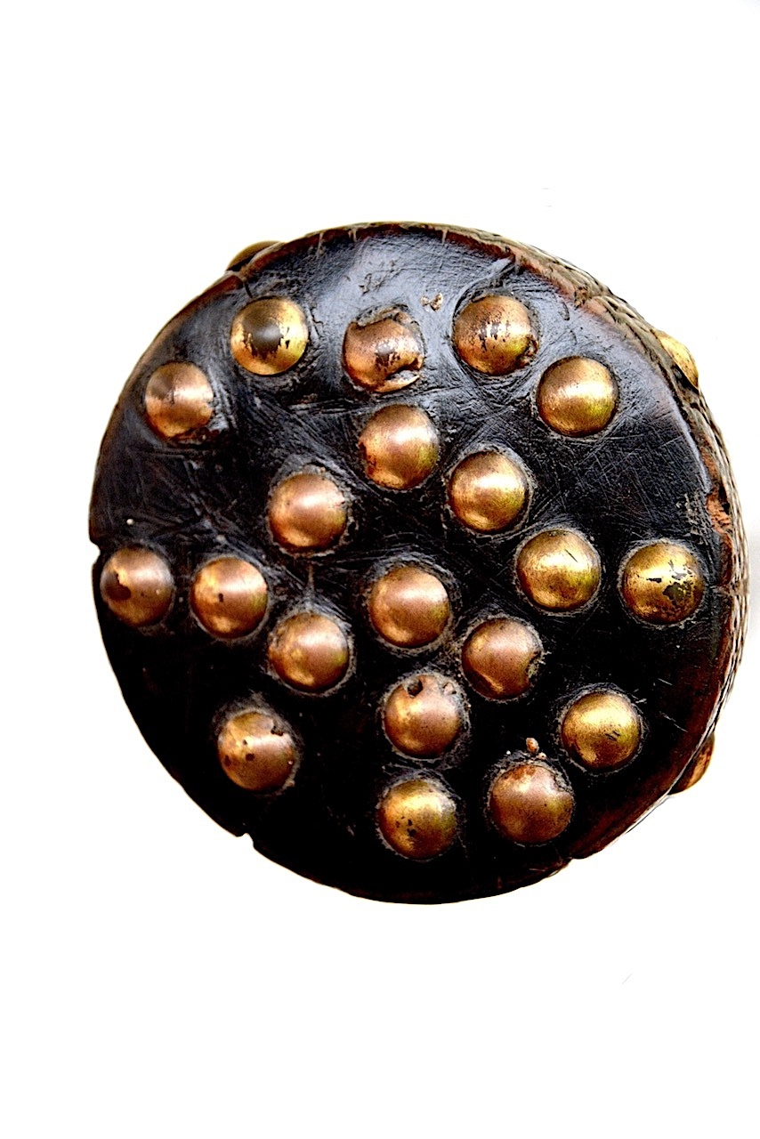 Le plateau est orné de clou en laiton sur toute la surface terminale, l’épaisseur est striée de lignes croisées avec quelques clous de laiton à espaces réguliers.