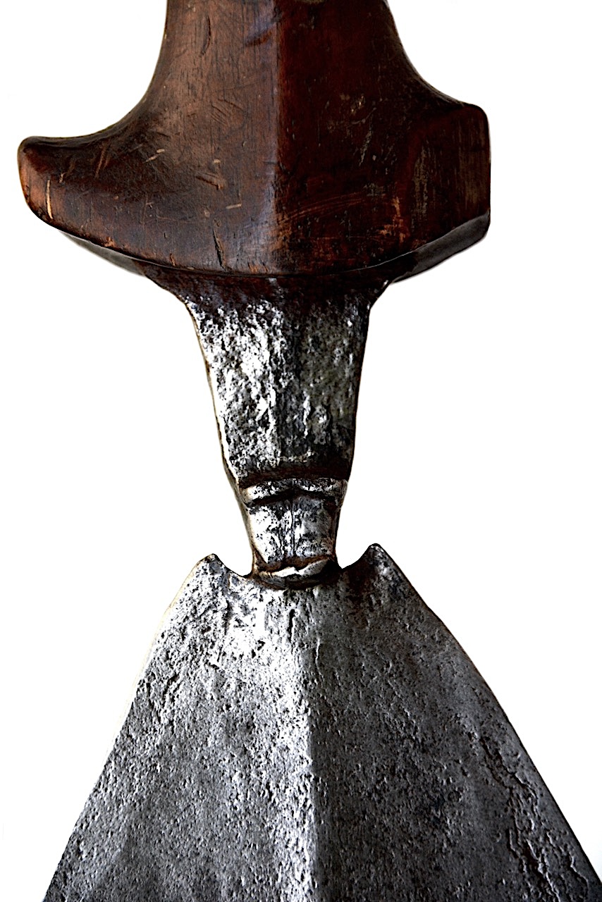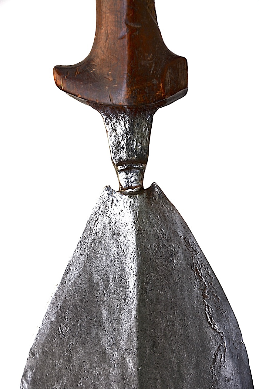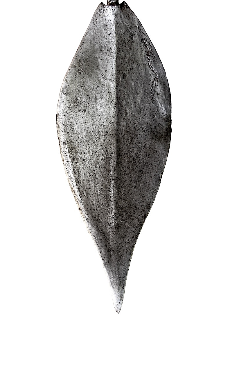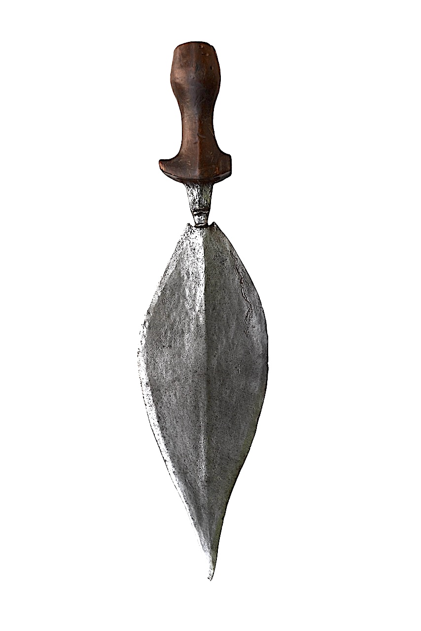 Épée courte à lame lancéolée large, en forme de feuille d’arbre à pointe prononcée.