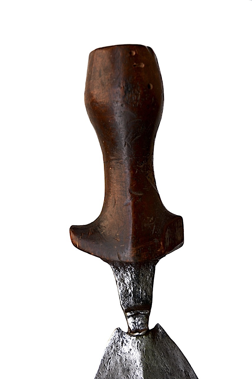 La poignée en bois, assez claire et de belle patine, possède une chape en chapeau de gendarme épaisse et monte en cylindre étranglé, pour finir en bulbe conique à bout plat.