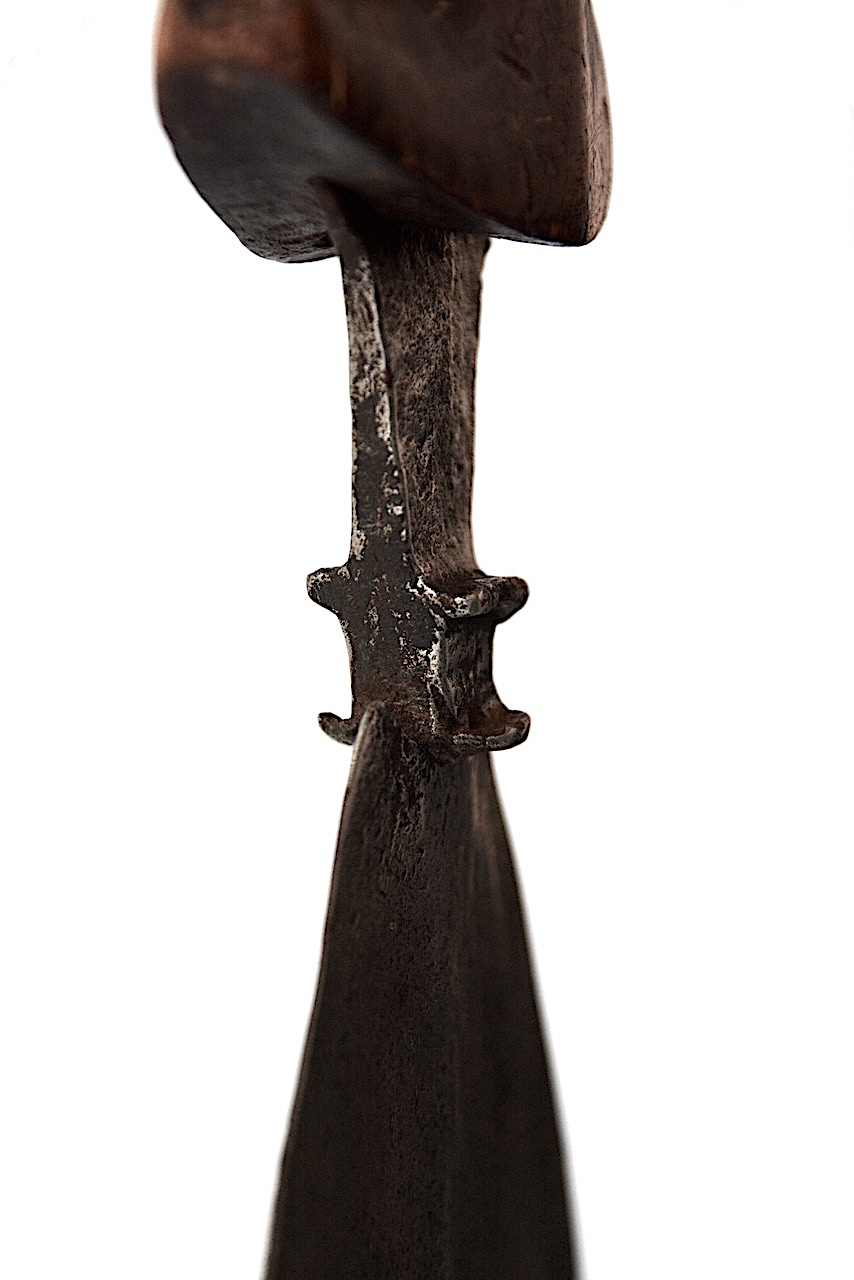 La base entre la lame et la soie est épaisse et s’ élargit dans la chape avant d’entrer dans la poignée, certainement pour se réduire à l’intérieur.