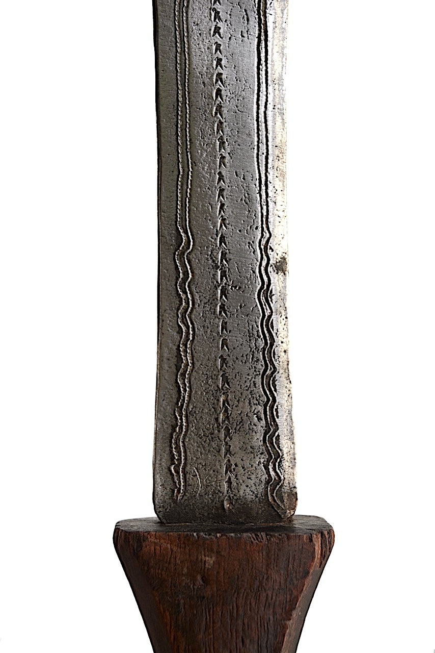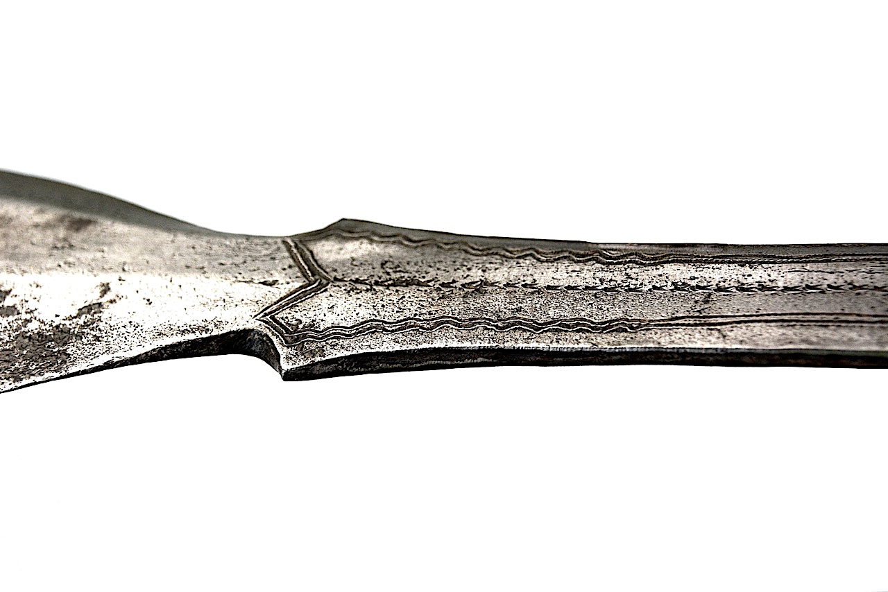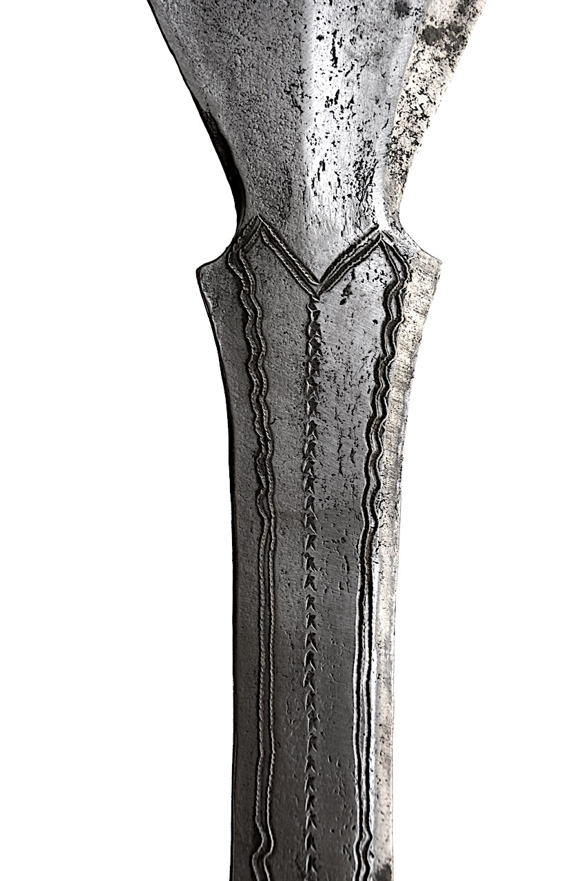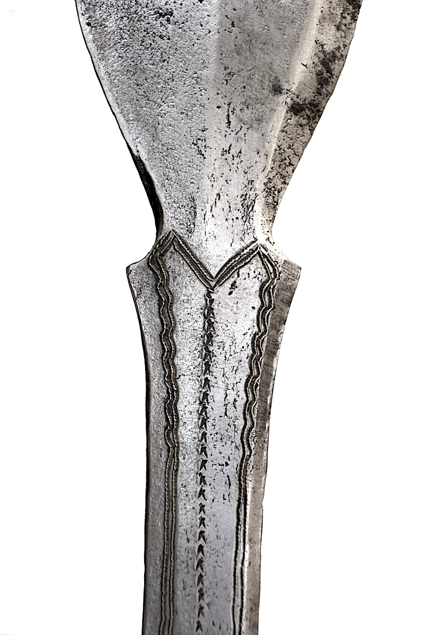 L’axe central du corps est ciselé d’une ligne en flashs « tête de flèches », et les bords de lame sont ornés de deux lignes en vagues parallèles rejoignant l’épaulement évasé.
