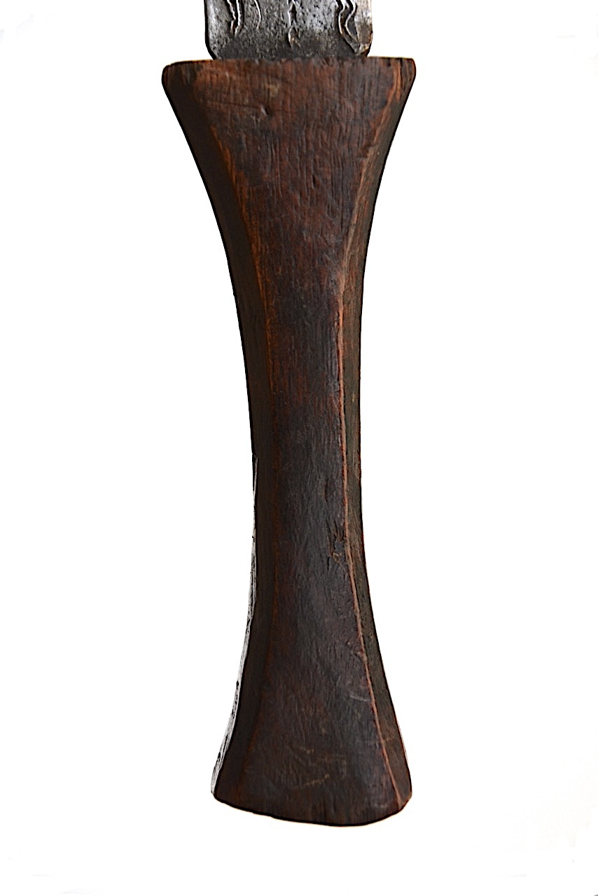 La poignée est en bois, de base rectangulaire à étranglement central, elle n’est pas traversée par la soie.