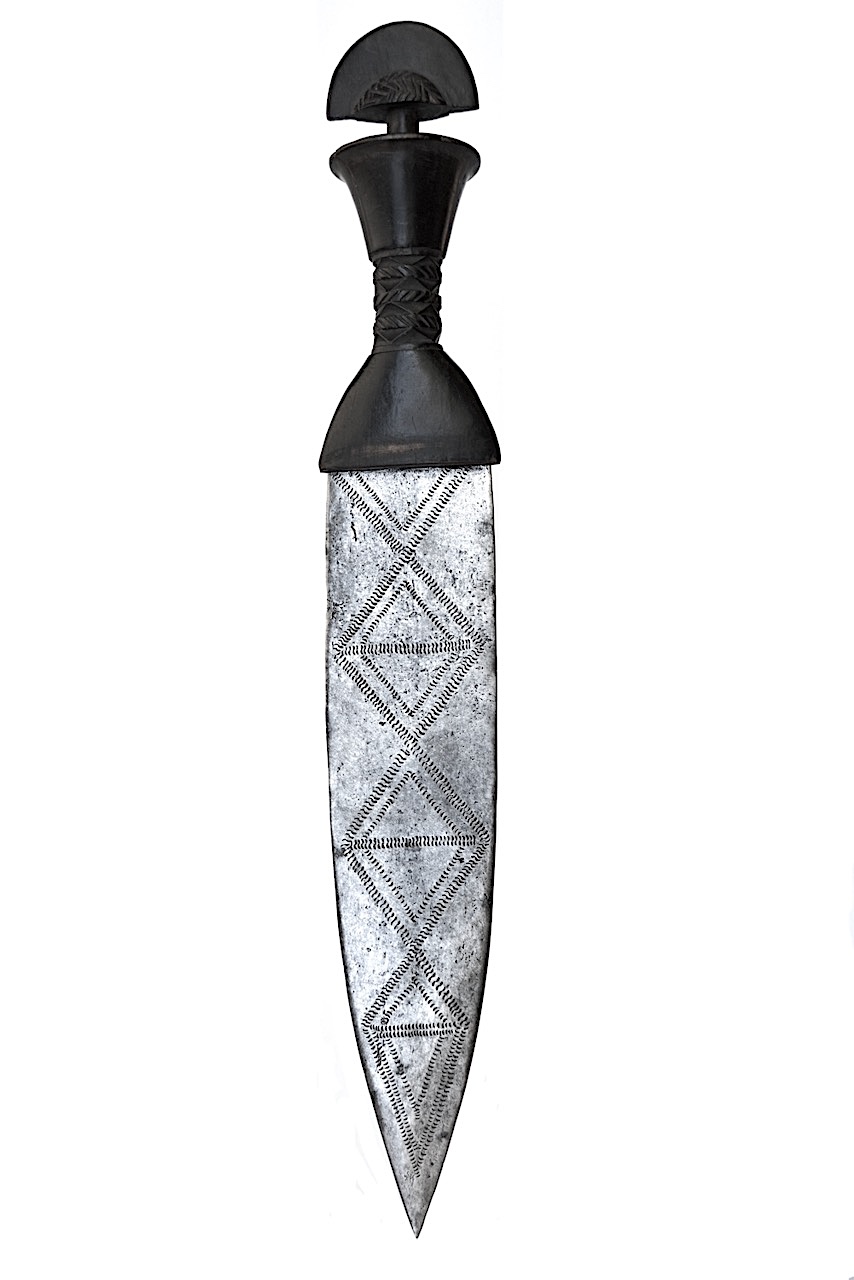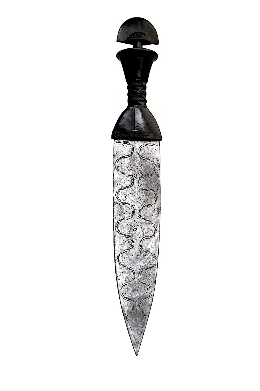 Épée courte à lame large et lancéolée, plane et bien affûtée.