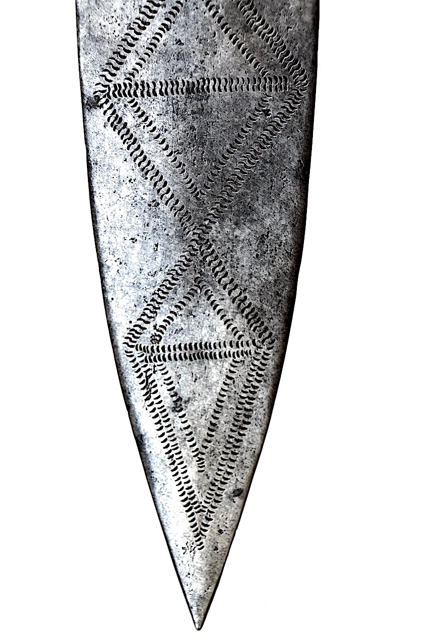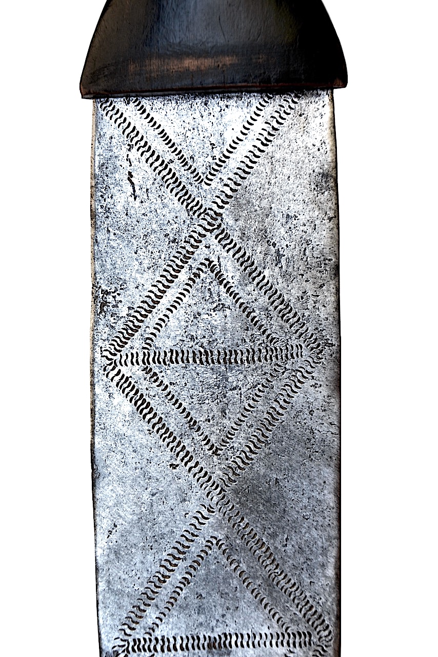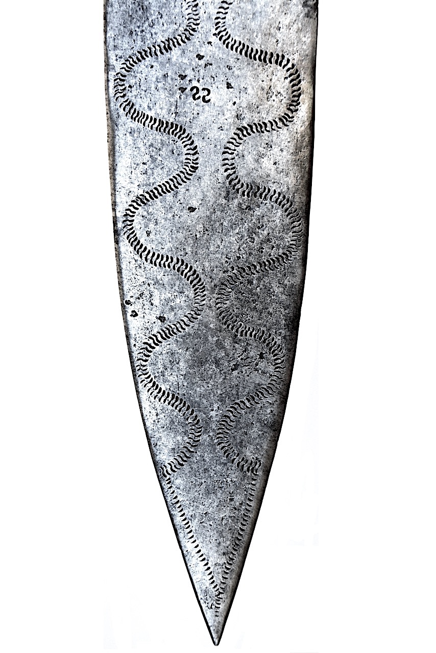 L’autre face possède deux lignes (en petits « s » également) qui partent à plat de sous la chape et forment de grandes ondulations, inversées face à face et se rejoignant en pointe, dans la pointe de la lame.