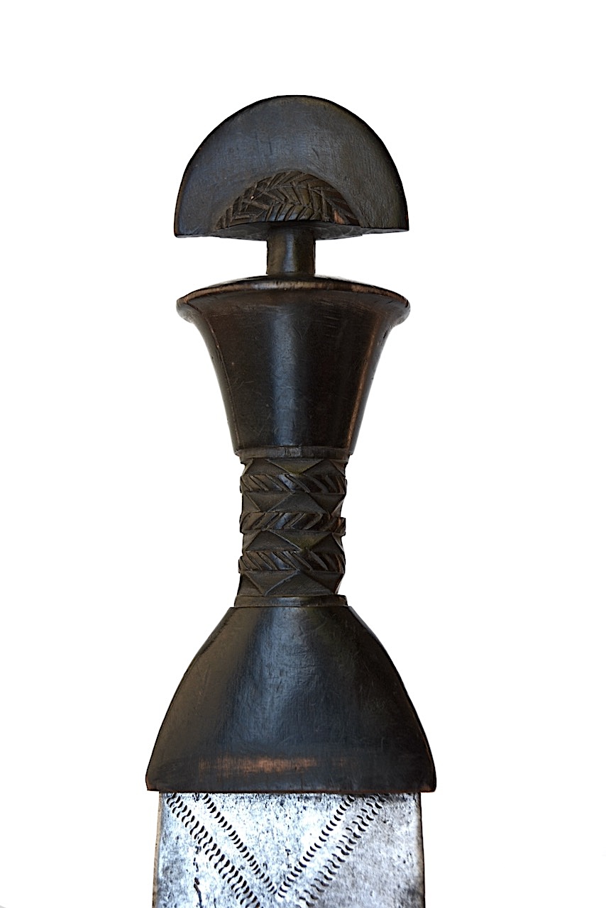 La poignée est en bois sombre avec une chape débordante et pas très épaisse, puis une petite partie de base cylindrique entièrement sculptée en facettes à angle et intercalée d’anneaux à motifs tressés.