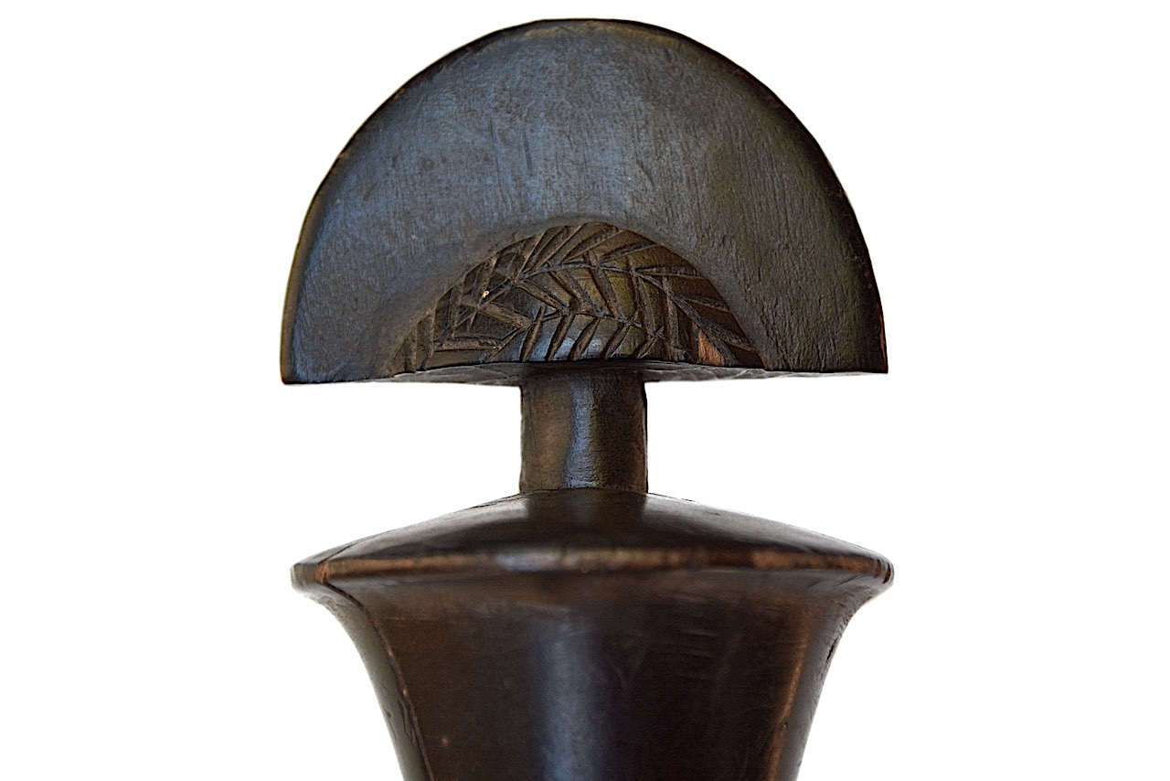 Ensuite, un beau cône s’évase vers le haut formant un rebord circulaire légèrement bombé avec au centre une petite partie cylindrique supportant un demi-disque à base enflée et striée dans le style Mossi.