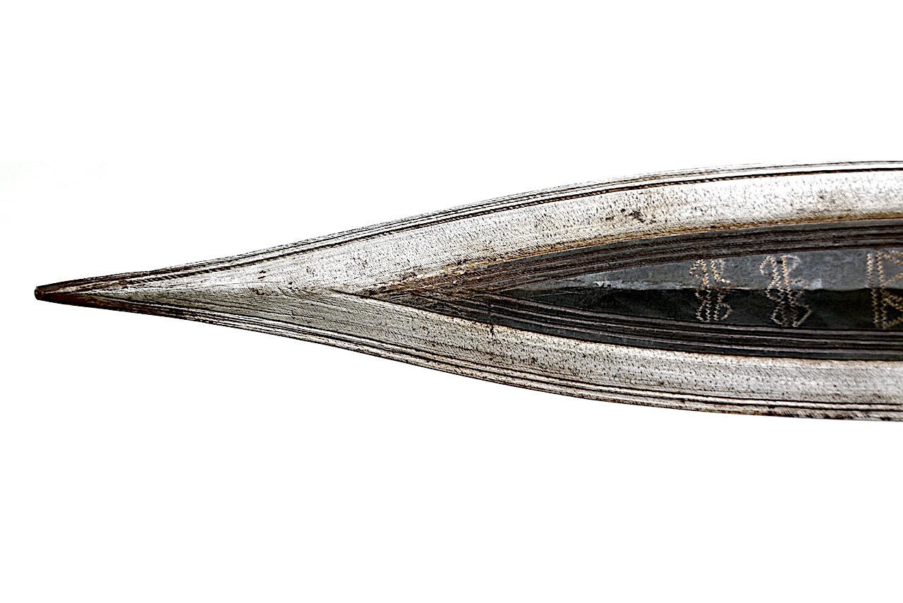 La monture et la lame sont forgées d’une seule pièce et le pommeau terminal est de forme semi-elliptique laissant apparaître un fer à l’oxydation sombre bleutée énergiquement martelé.
