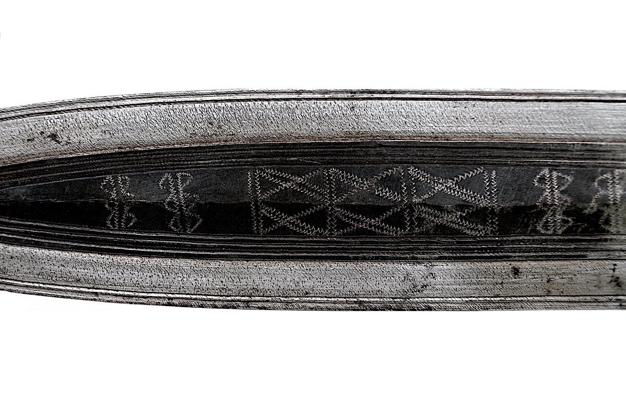 La face est décorée d’une partie sombre axiale, reprenant la forme de la lame, avec deux rainures parallèles le long du bord de lame.