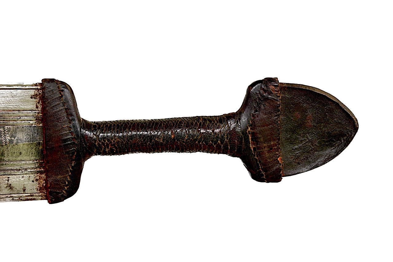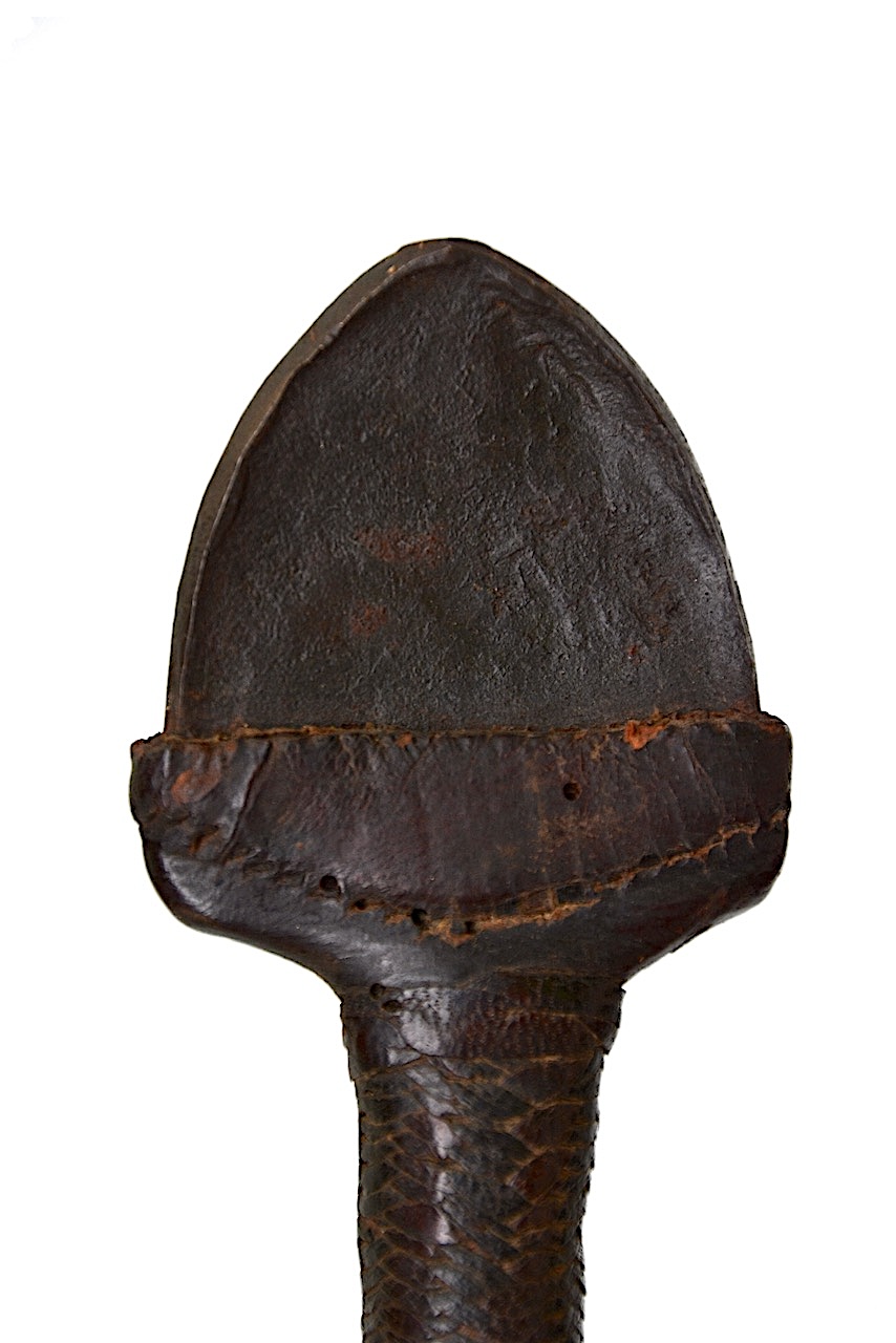 La base du pommeau, la fusée et la garde sont généralement recouvertes d’un manteau de cuir finement ajusté.