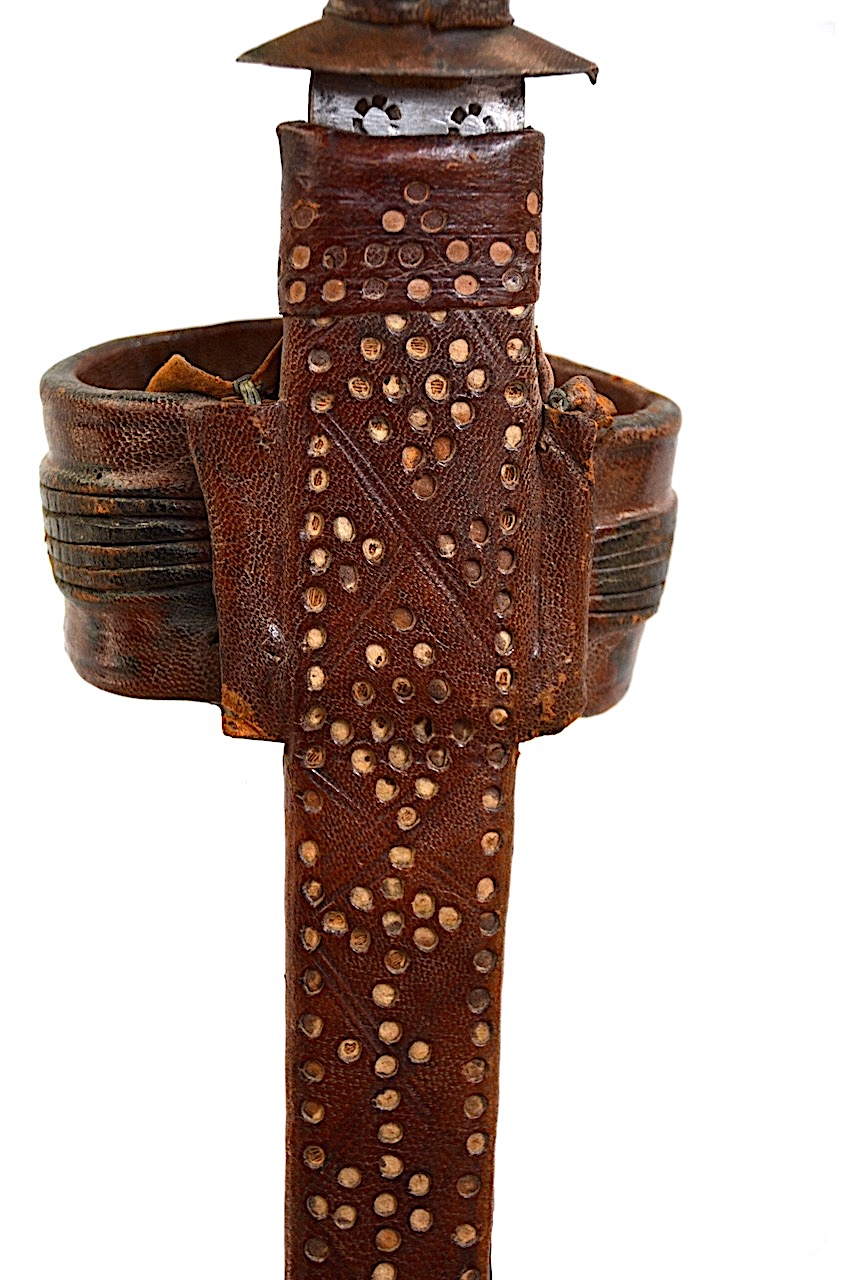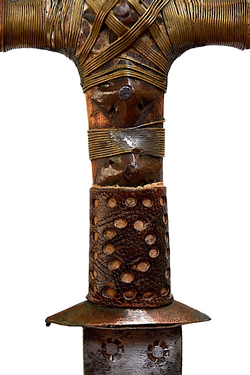 La partie en croix est recouverte de fils de laiton enroulés et croisés, censés arrêter les hémorragies, et qu’affectionnent en particulier les artisans de l’aïr et les Kel Gress.