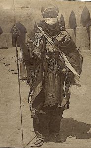 les vêtements bleus, le litham* qui ne laisse entrevoir que les yeux, l’armement et le grand bouclier arer ou agar.
