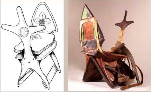 Ces dernières sont parcourues en leur centre de longues goutières longitudinales, en général au nombre de quatre et gravées de lunes et de soleils à visages humains.