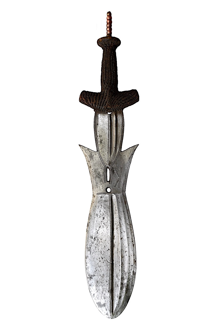Cette épée courte nommée pamba possède une poignée en bois à pommeau de base cylindrique et garde cruciforme.