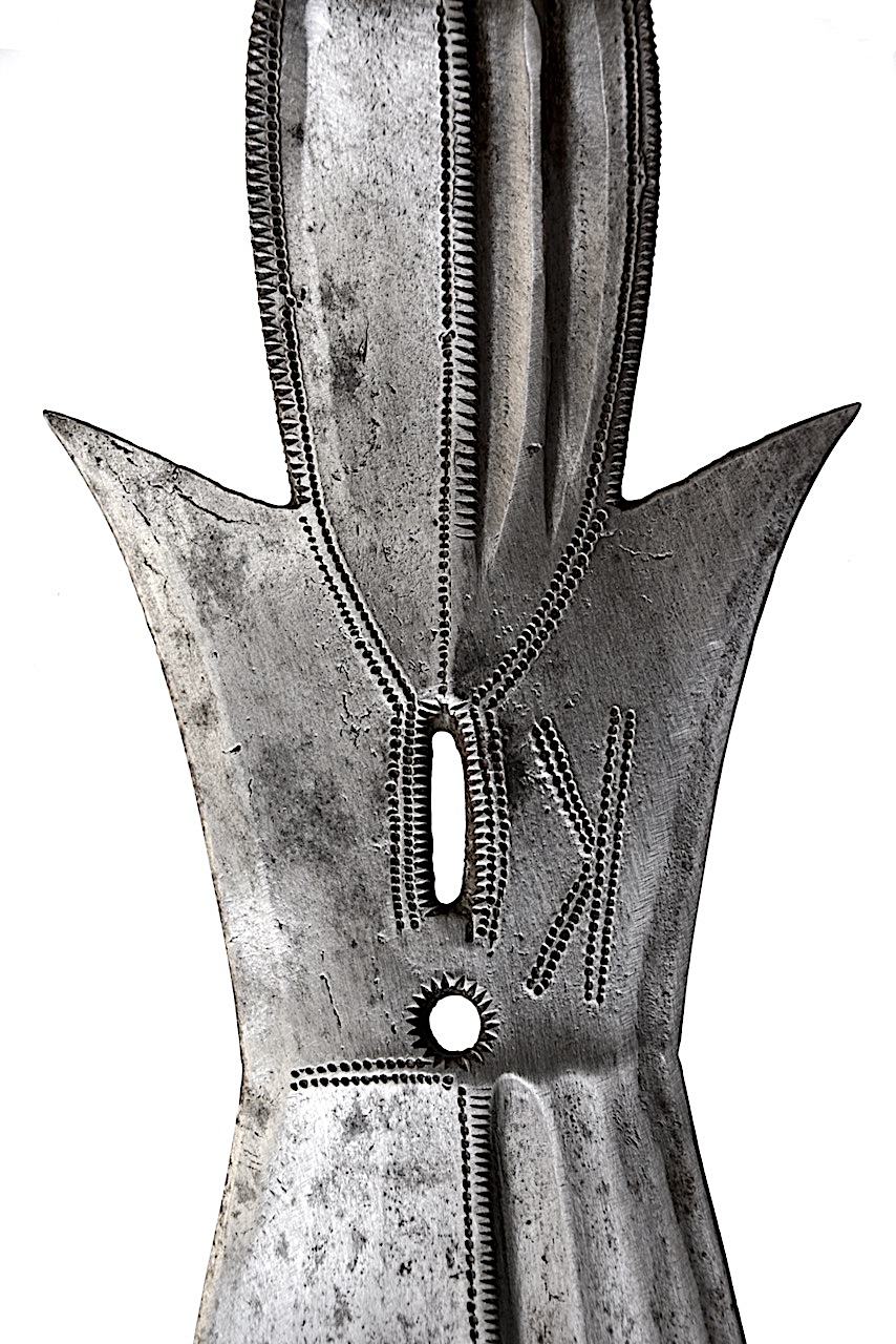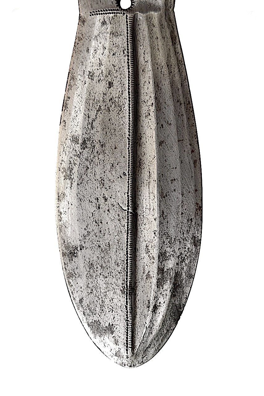 Après un élargissement formant deux ergots remontants bilatéraux, la lame s’étrangle percé d’une ouverture en lucarne et d’un trou en ligne axiale puis s’épanouit en une ellipse à pointe mousse ogivale.
