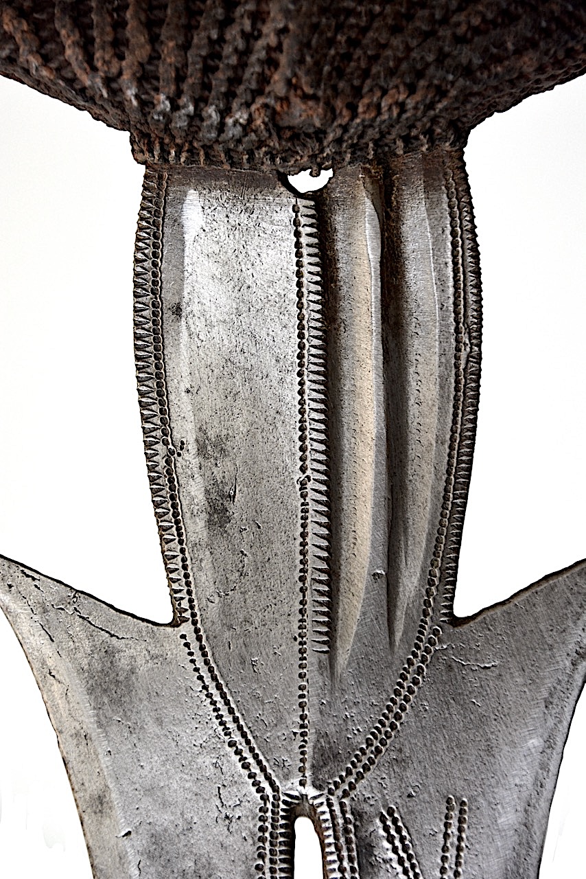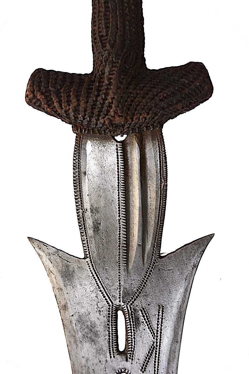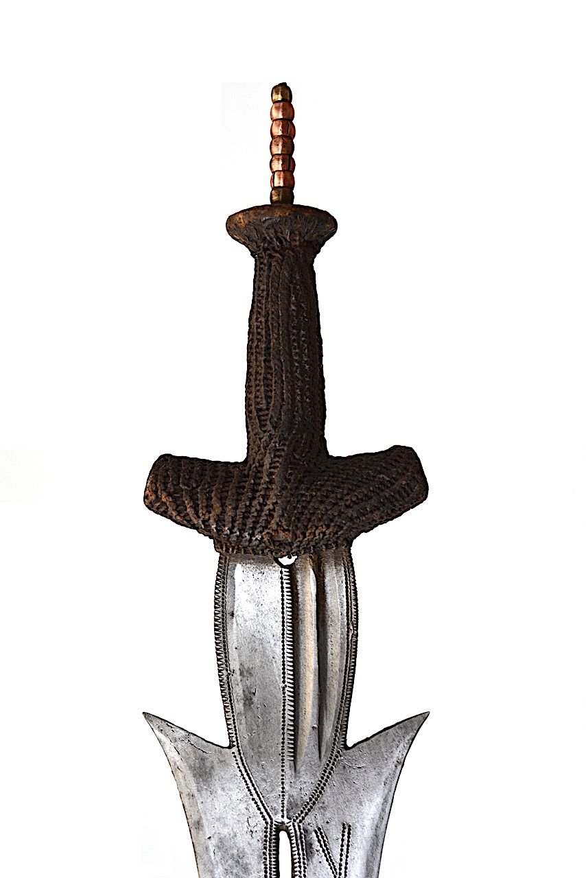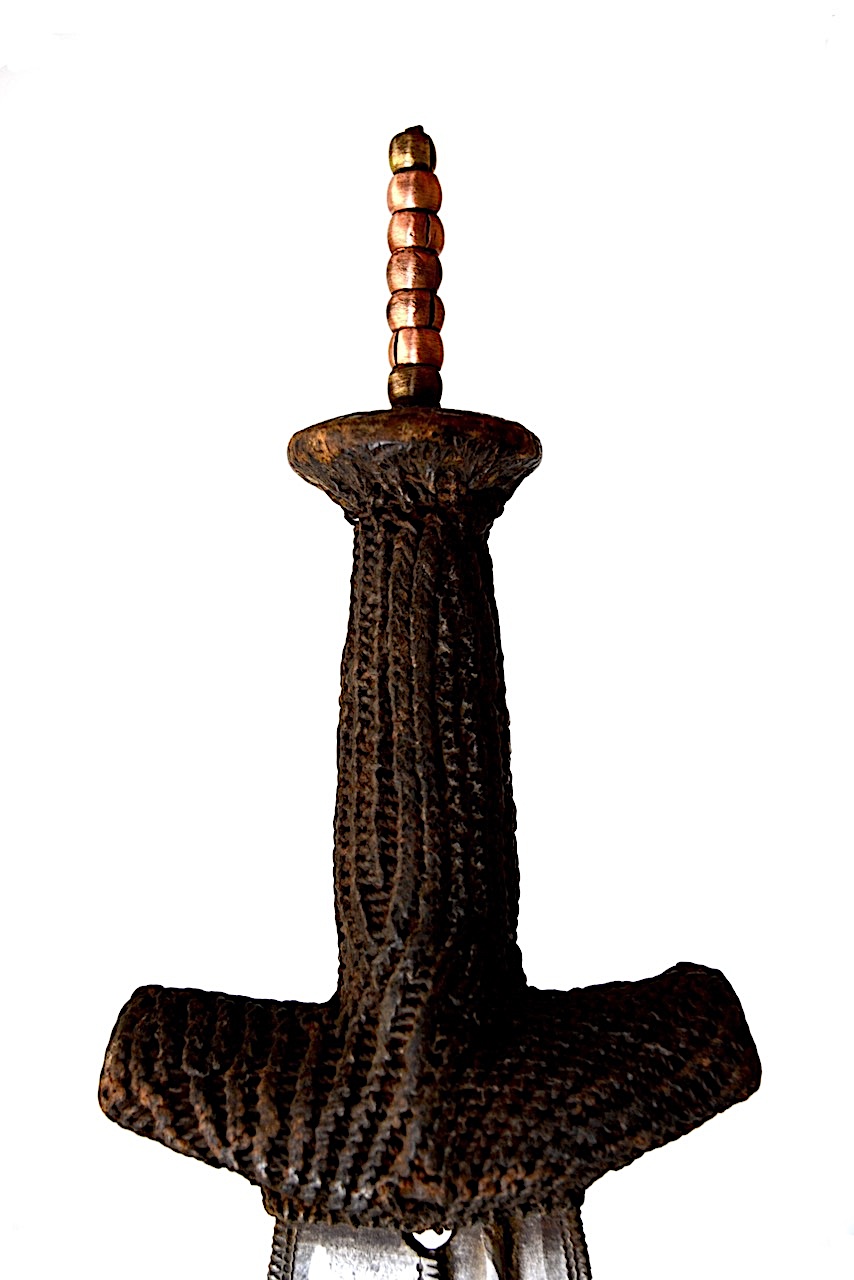 Cette arme est ancienne, la forge est forte dans du métal natif et lourd mais, surtout, la poignée est habillée sur l’évasement de peau de reptile, maintenue par le tressage subtil de nerfs ou fibres végétales tressées, couvertes d’une patine magnifique.