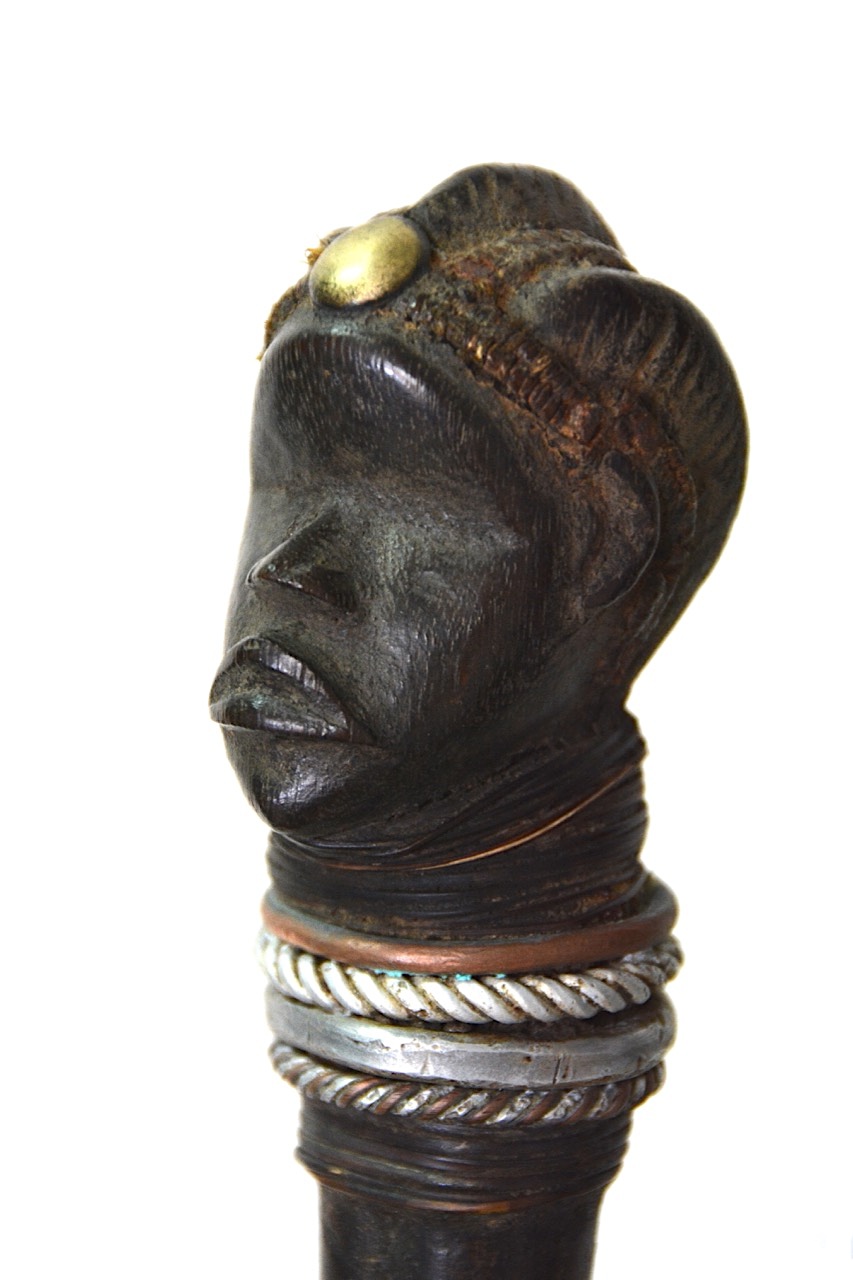 Rajoutée par dessus, on trouve, côté tête sculptée, une bague de cuivre, une d’aluminium à pans, une d’aluminium torsadée et une d’aluminium doublée en cuivre et torsadée également .