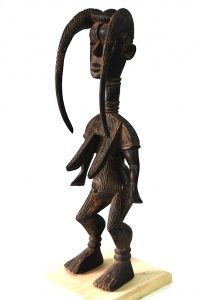 Le corps principal est un os de patte d’éléphanteau avec, à chaque bout, une pièce de bois sculptée.