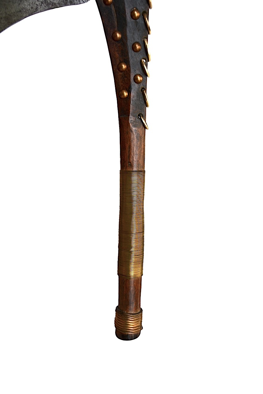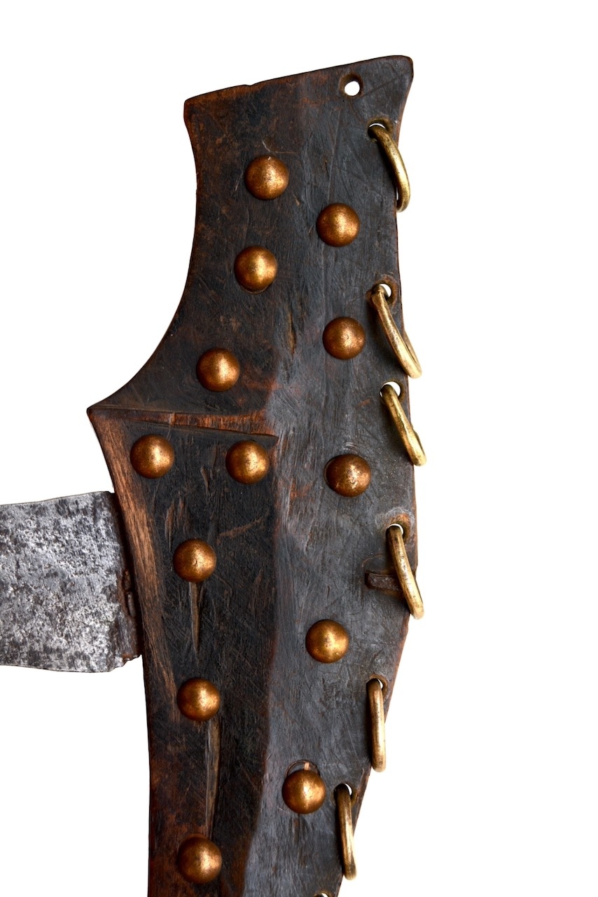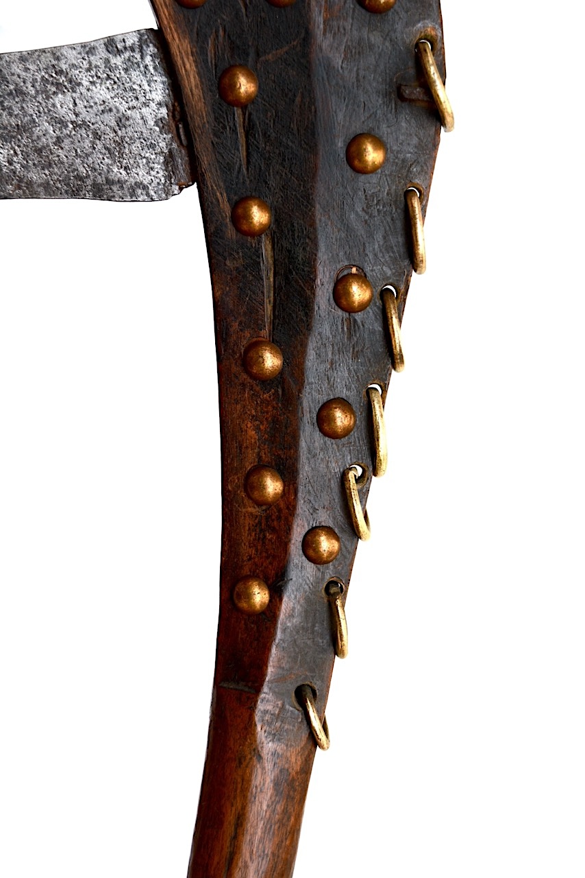 Les deux faces de la partie plate sont ornées de clous en laiton, de part et d’autre du renfort central.