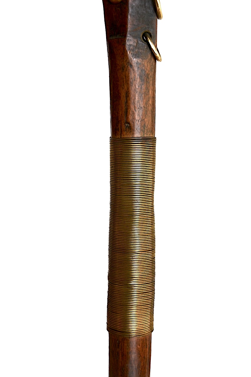 La partie basse cylindrique est entourée de fil de laiton sur une grande partie du milieu et, en bas, un enroulement en fil plus gros.