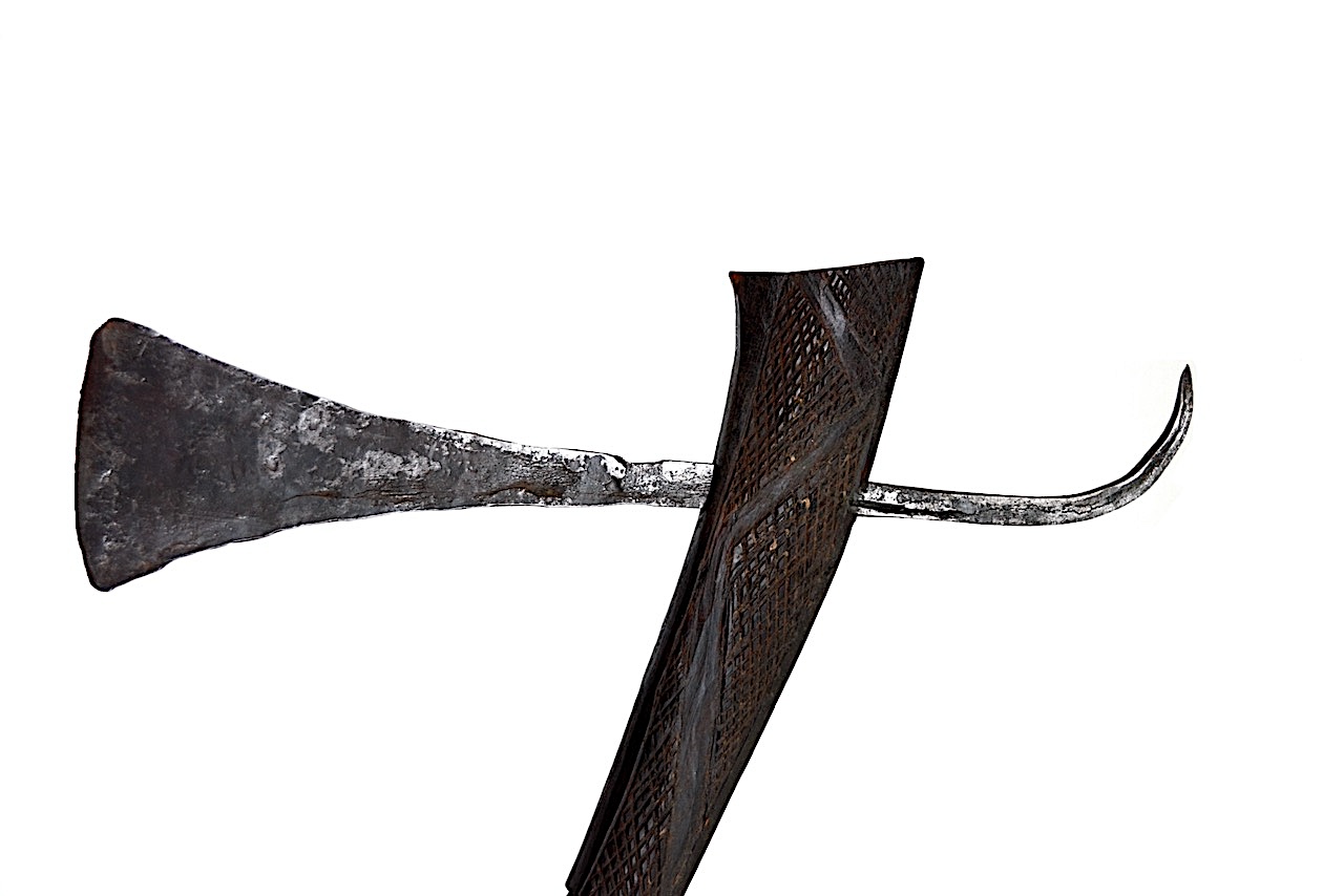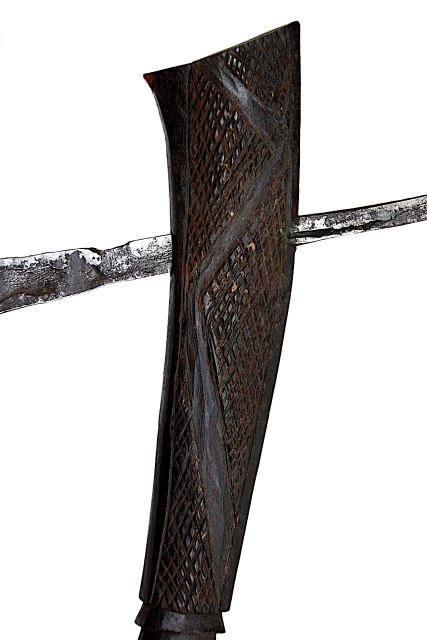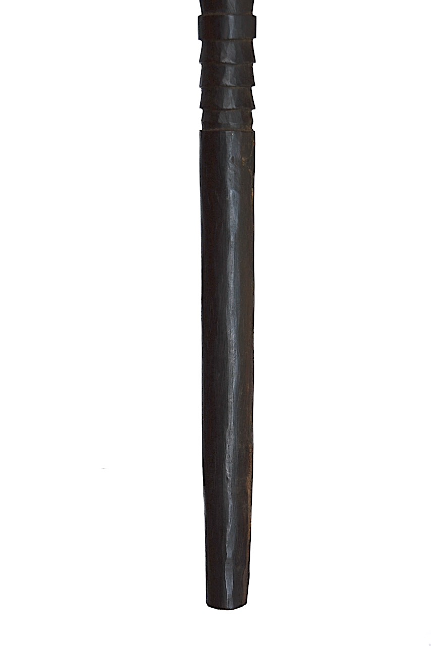 Le manche en bois principalement cylindrique possède une tête légèrement arquée de forme stylisée en crosse de fusil.