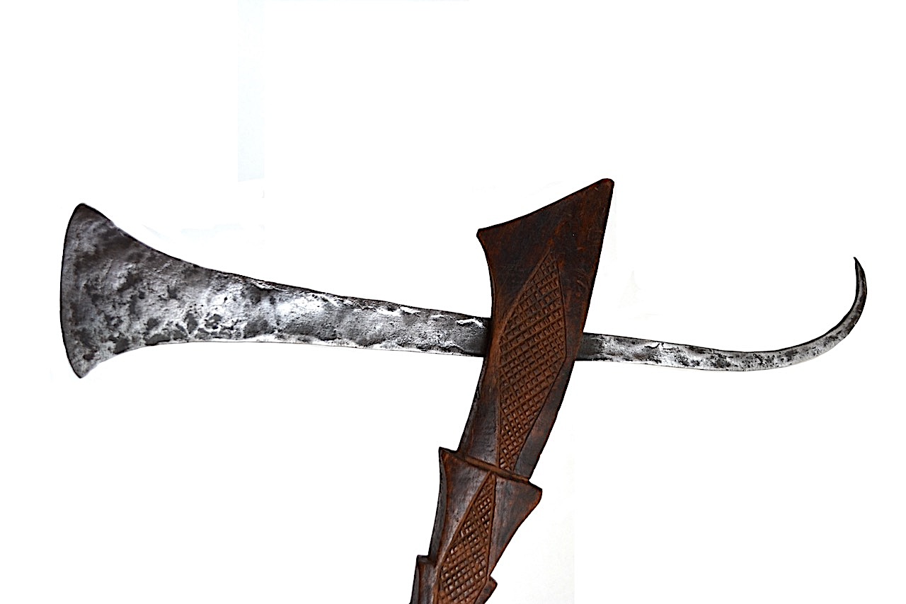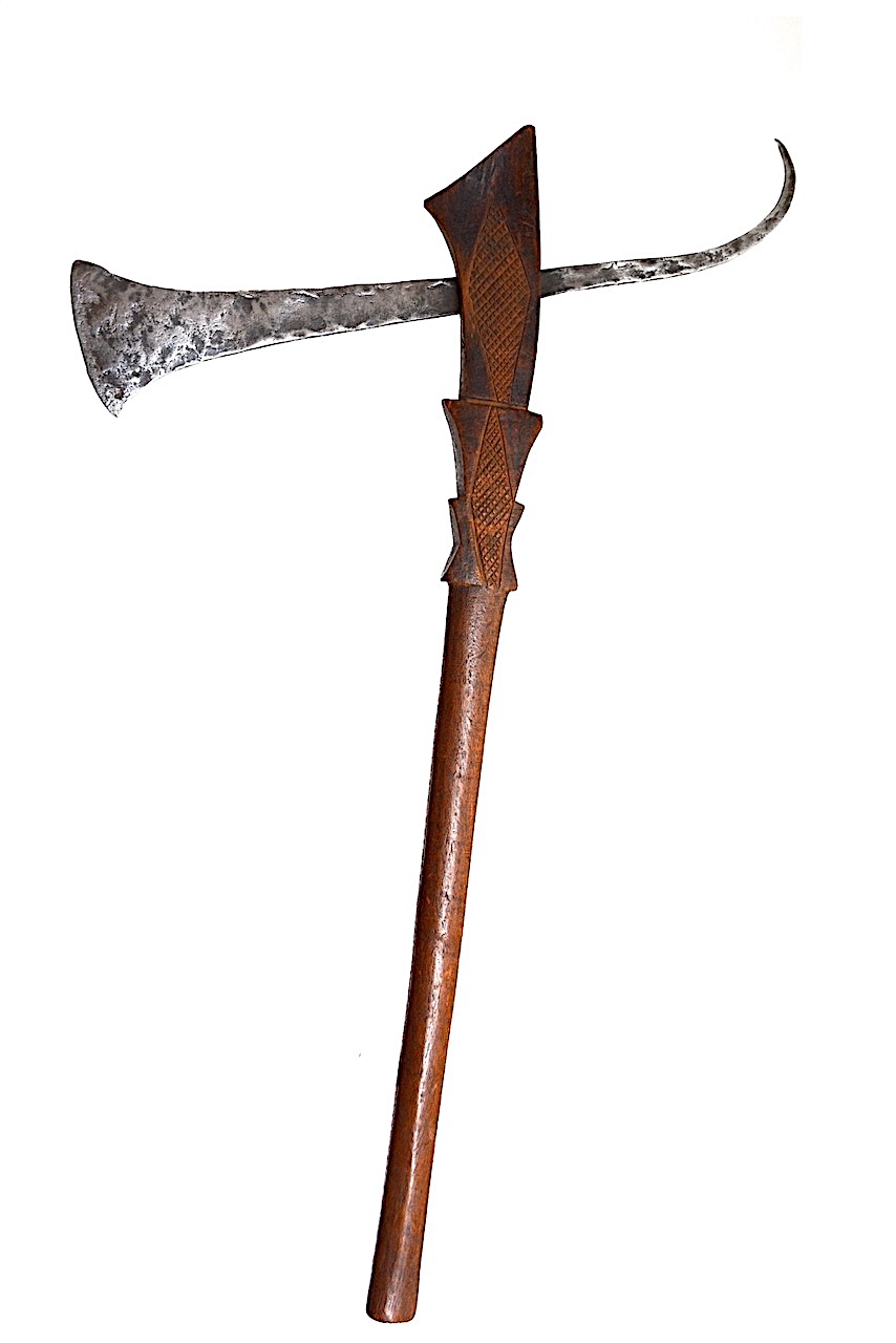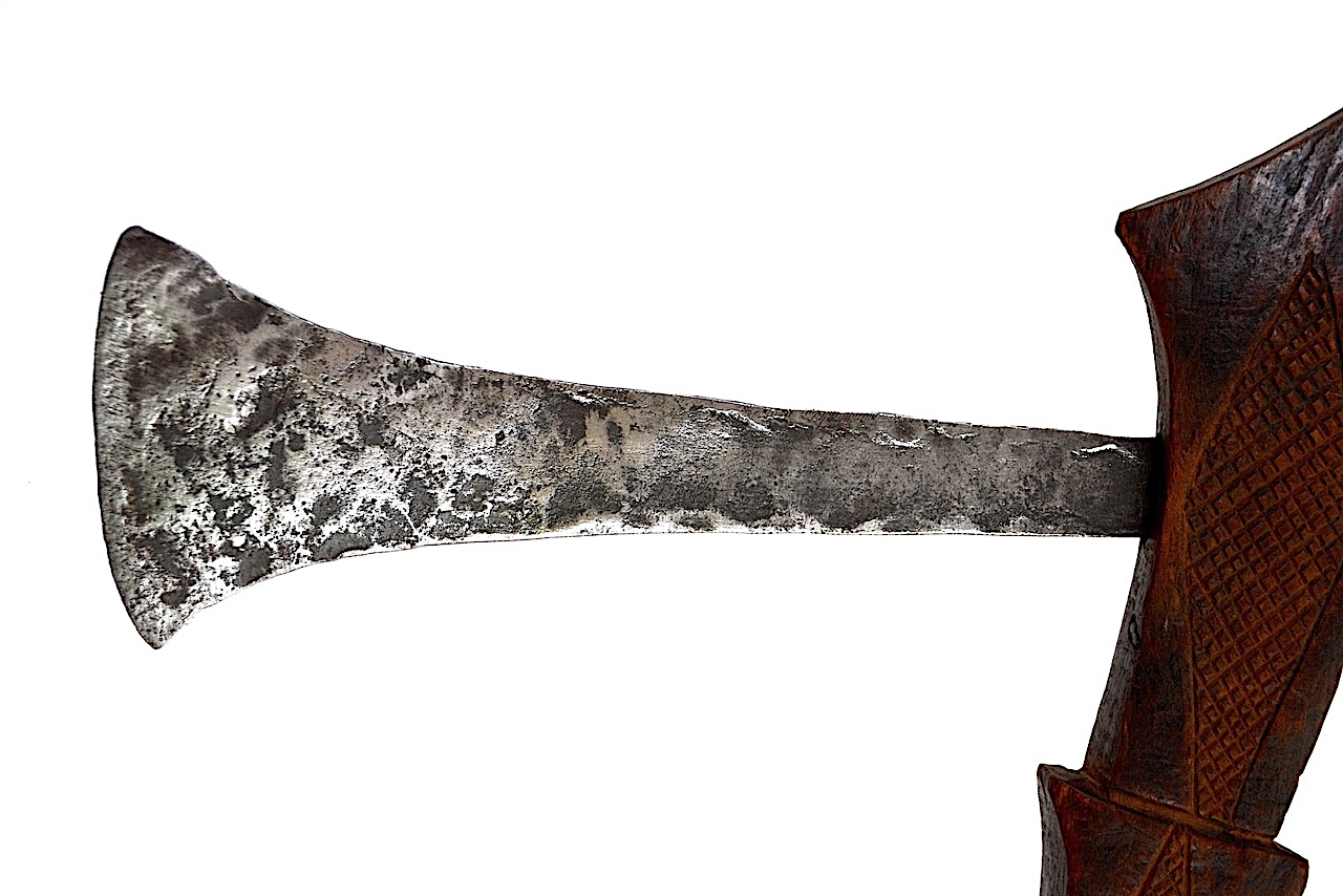 Hache très légère avec manche en bois clair, probablement une hache de cérémonie.