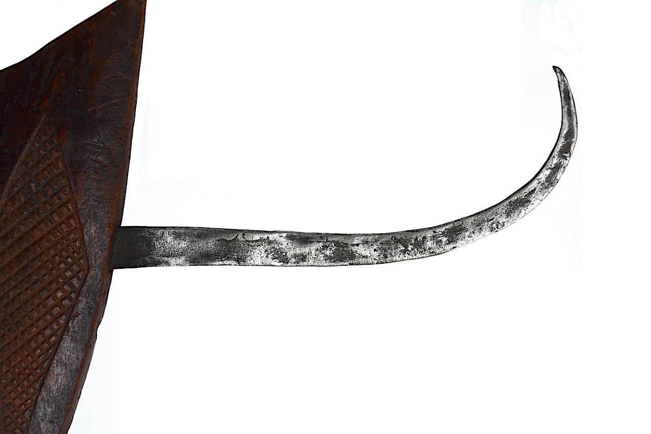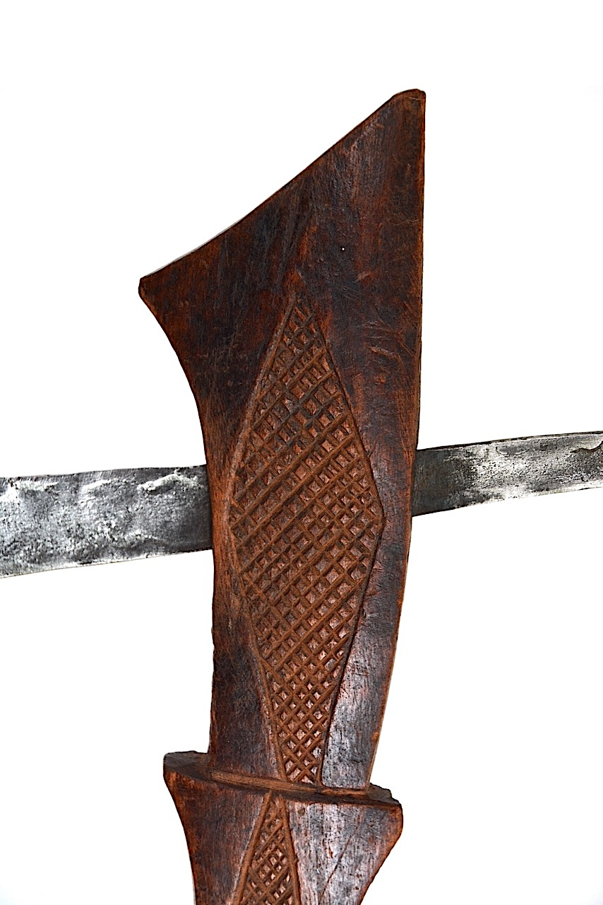 Le manche en bois cylindrique en bas s’ovalise en montant vers la tête légèrement arquée de forme stylisée en crosse de fusil.