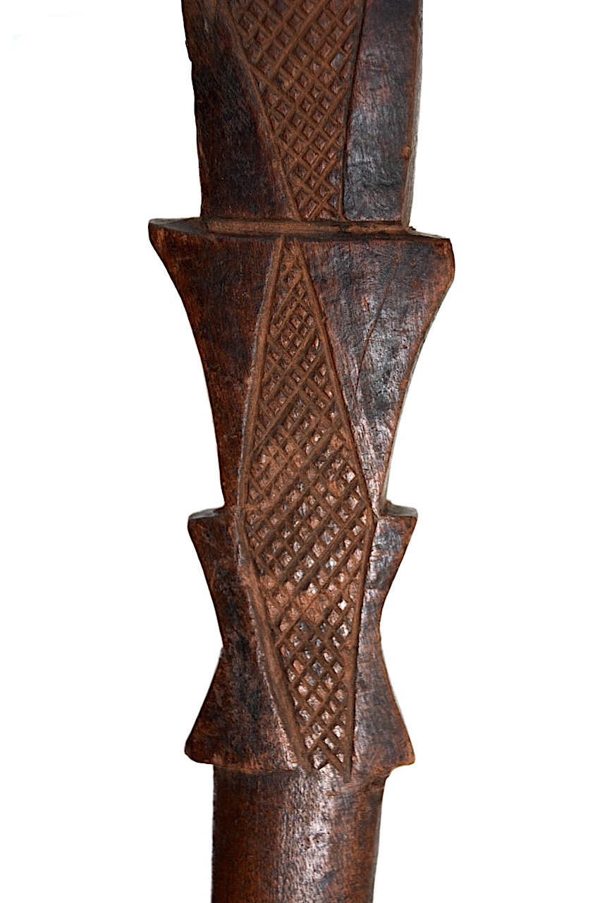 Cette crosse en haut gravée d’une forme de losange est striée de lignes croisées surplombant une partie de tête où se trouve le même décor en plus petit, ceci recto-verso.