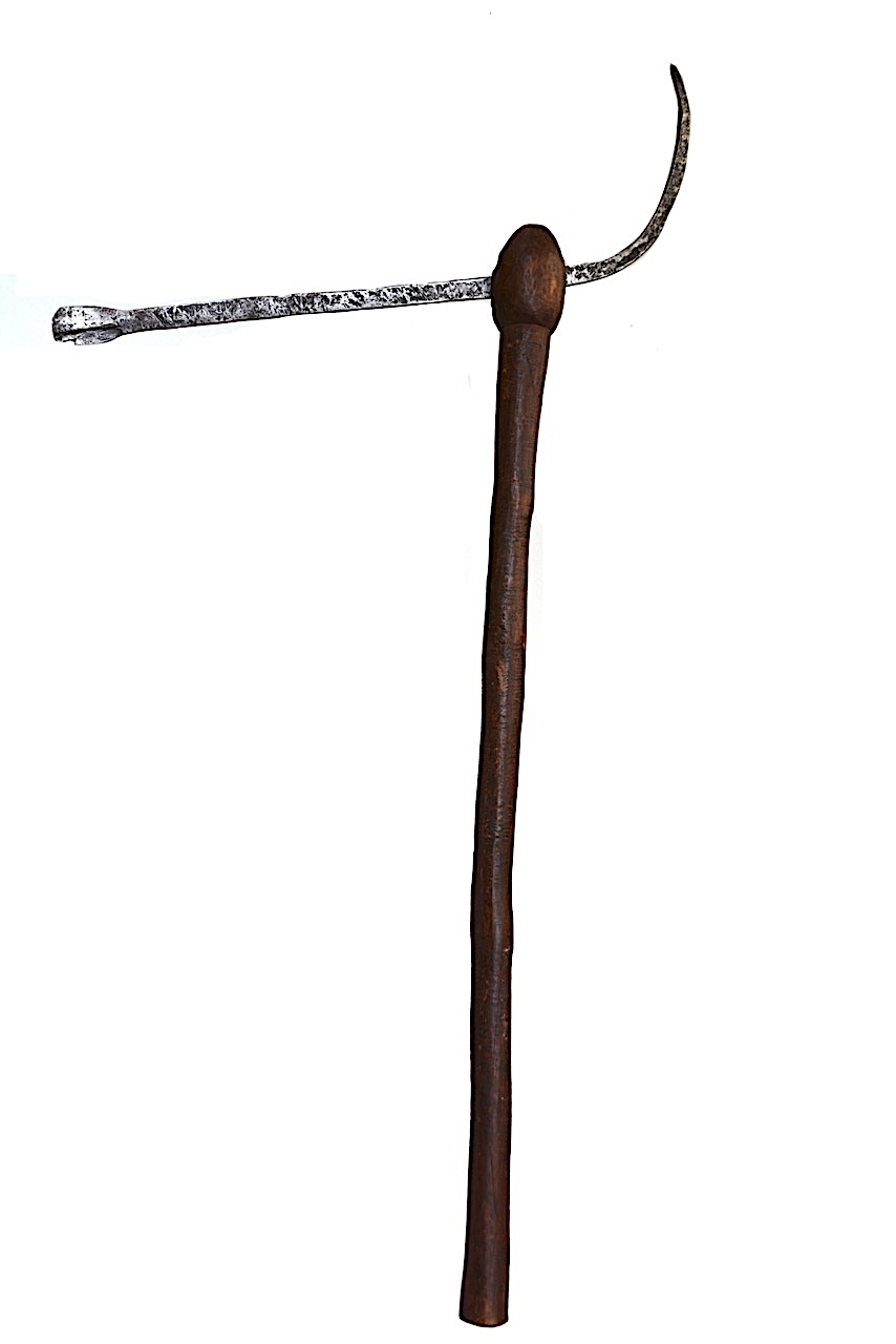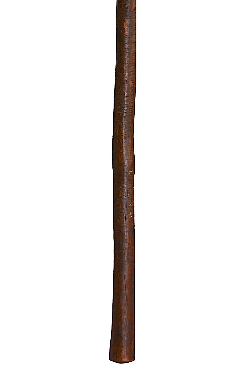 Le manche  est en bois noueux d’une seule pièce à peu près cylindrique et possédant une tête en forme d’œuf.