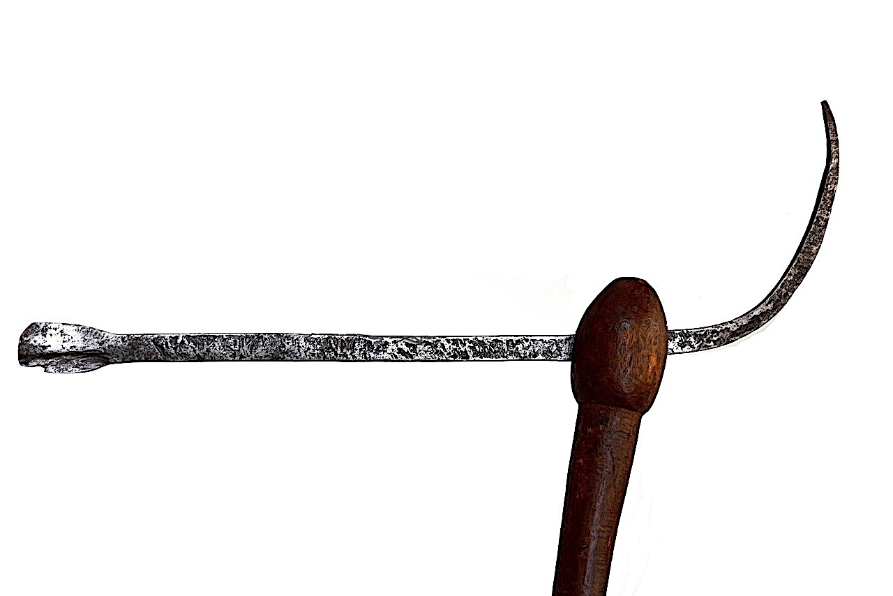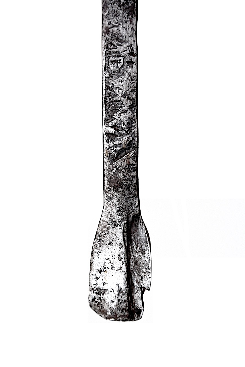 La lame en fer forgé présente un bout épaté plat avec un épaulement central pour une meilleure rigidité.