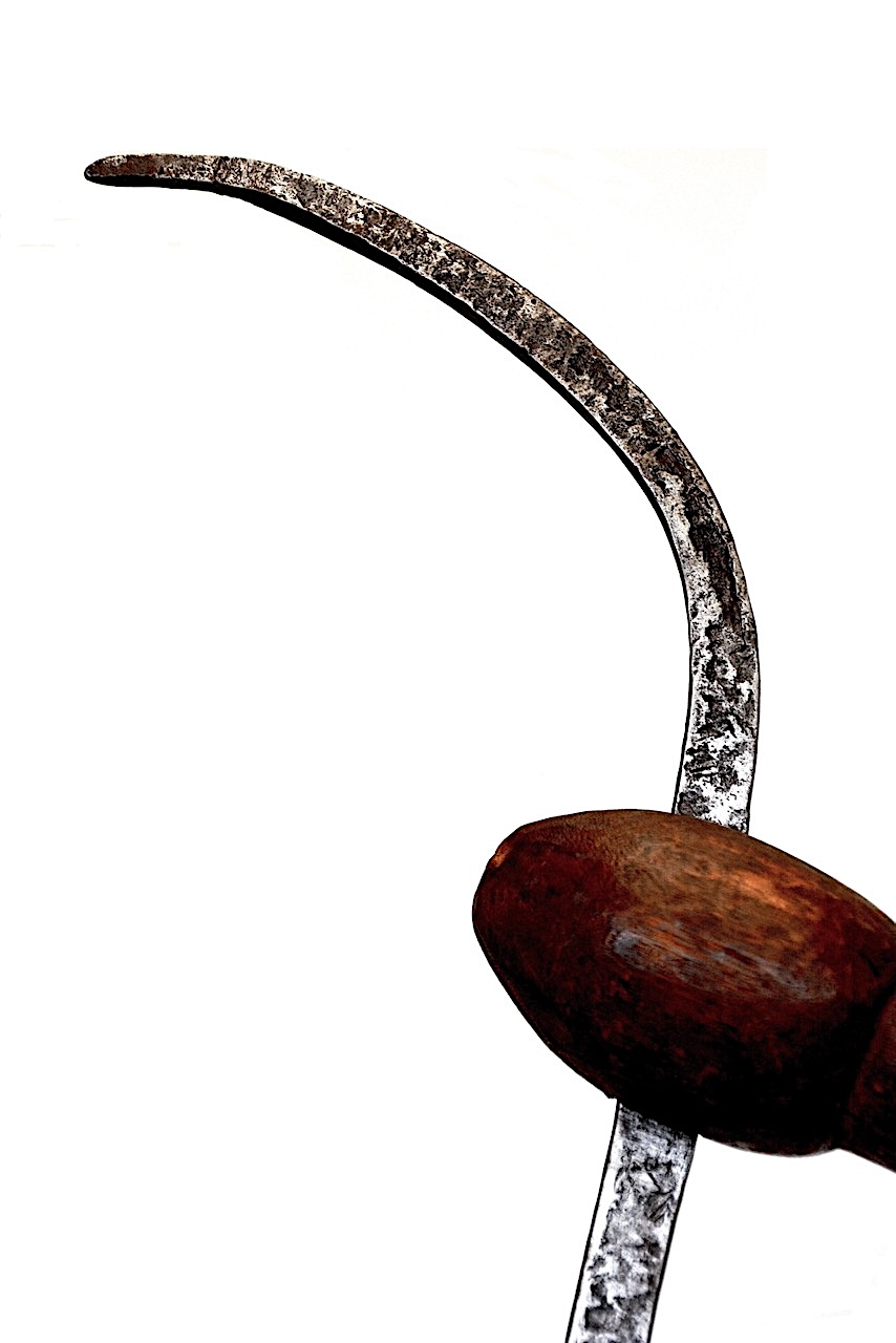 L’autre extrémité traverse la tête ovoïde du manche et remonte en courbe et en pointe jusqu’à dépasser la hauteur de la tête.