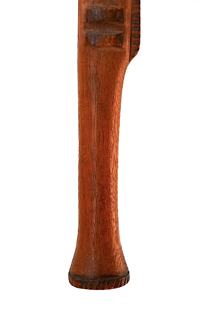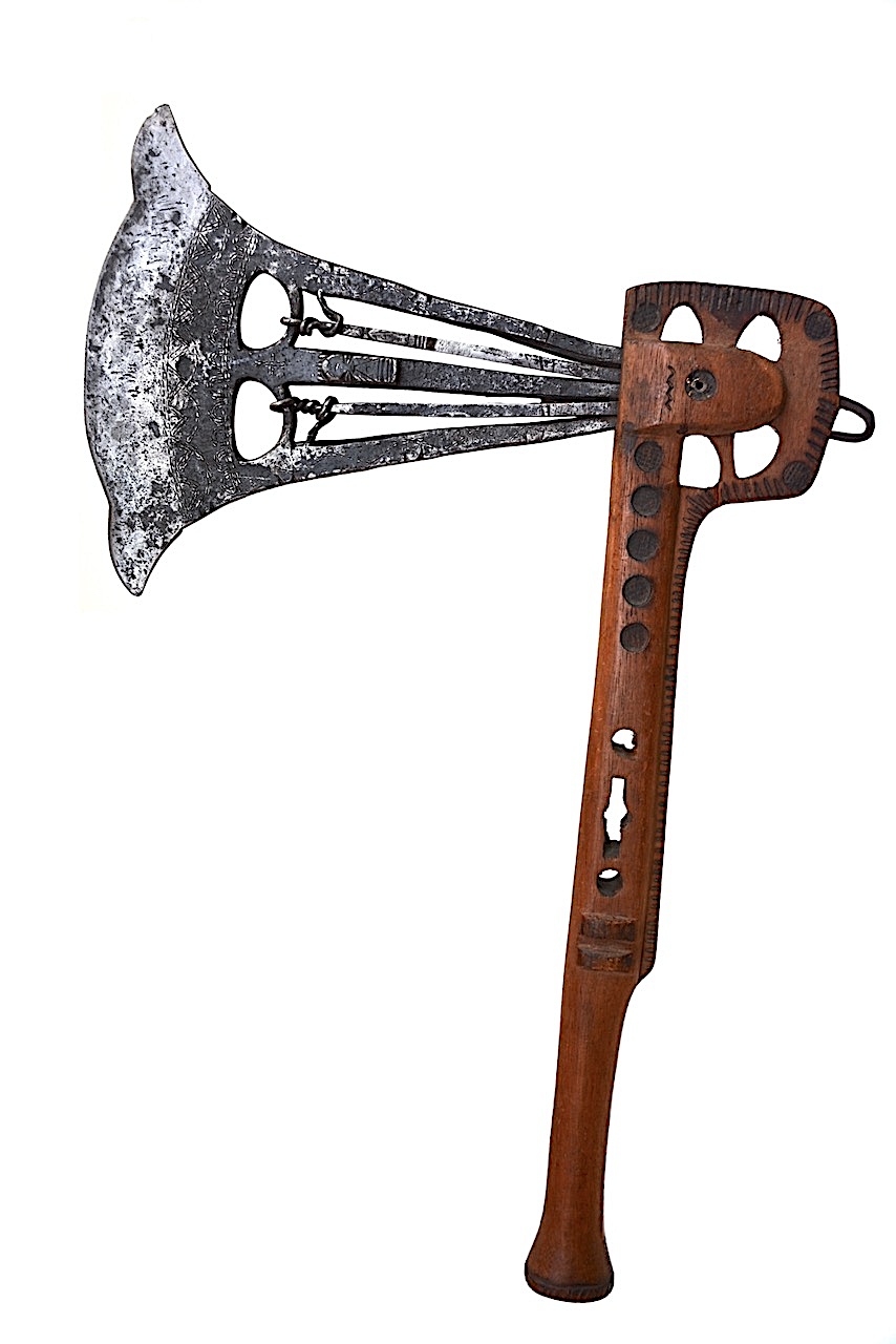 Grande hache Lunda d’Angola, manche en bois clair de Combretum zeyheri comportant une frise de triangles (mapembe) ajourés autour de la tête.