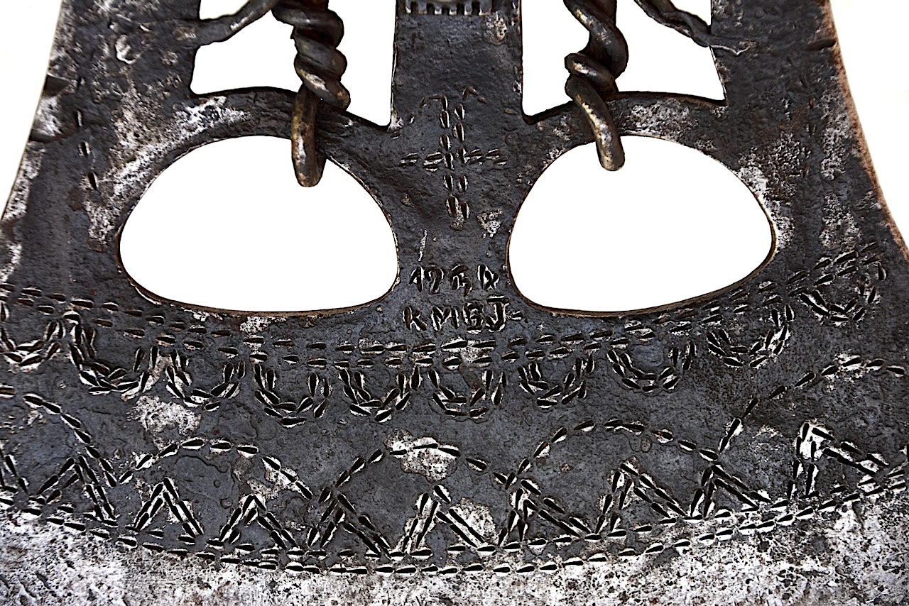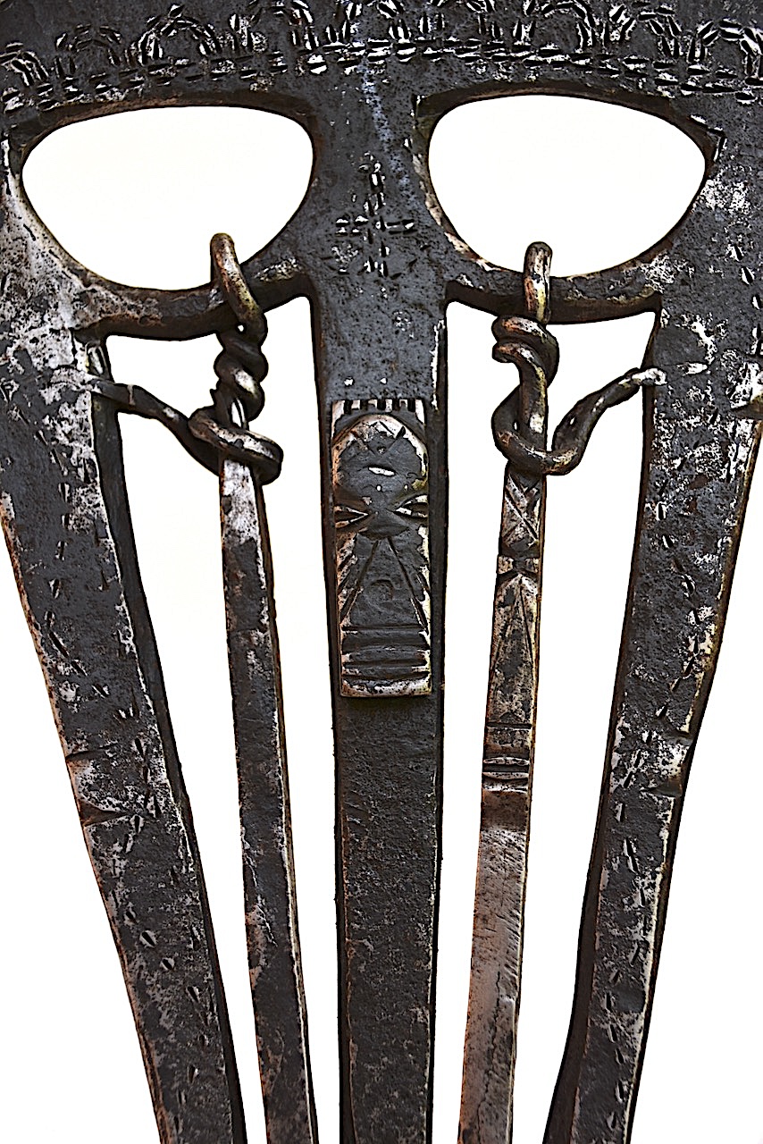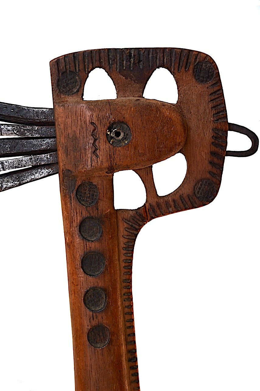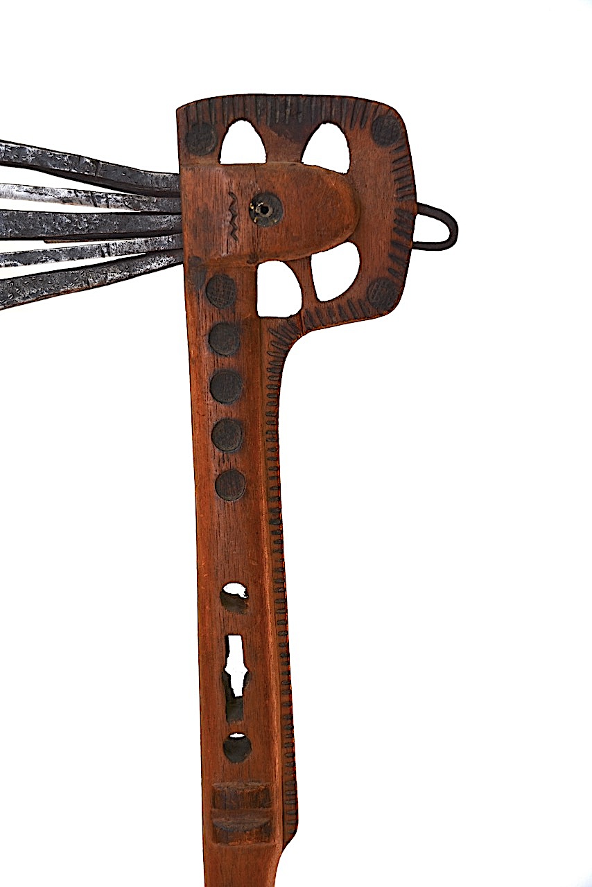 Très beau travail d’ingéniosité, une tête plate kifwébé est rapportée au centre de la lame sur la branche large du milieu, tout ceci sur les deux faces.